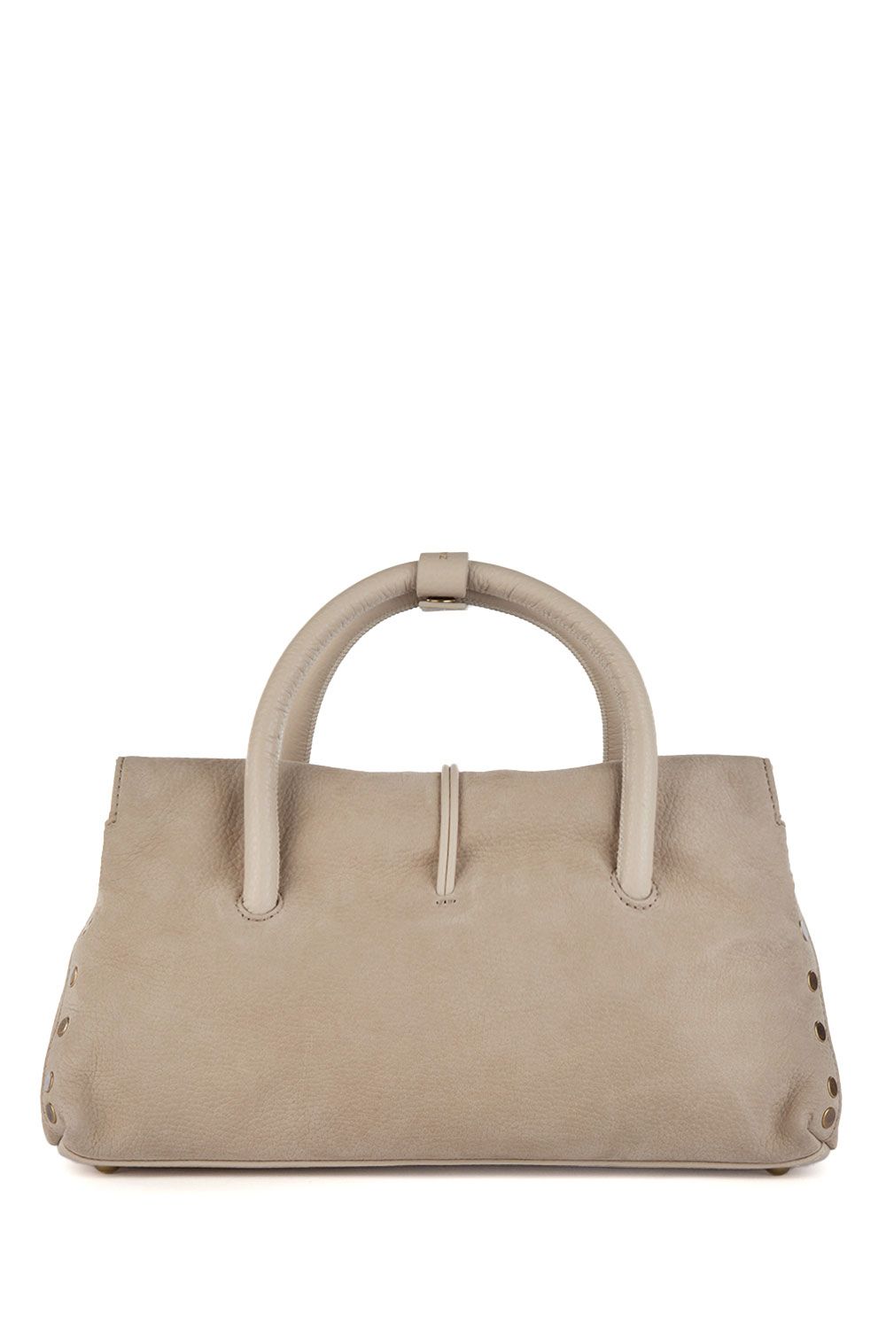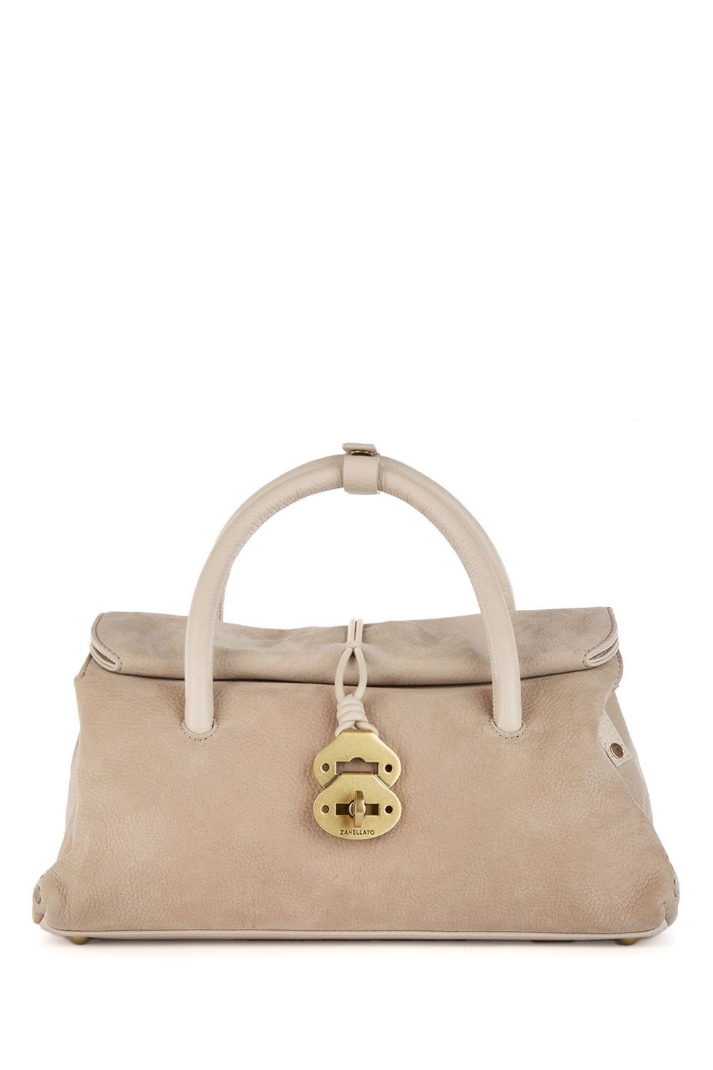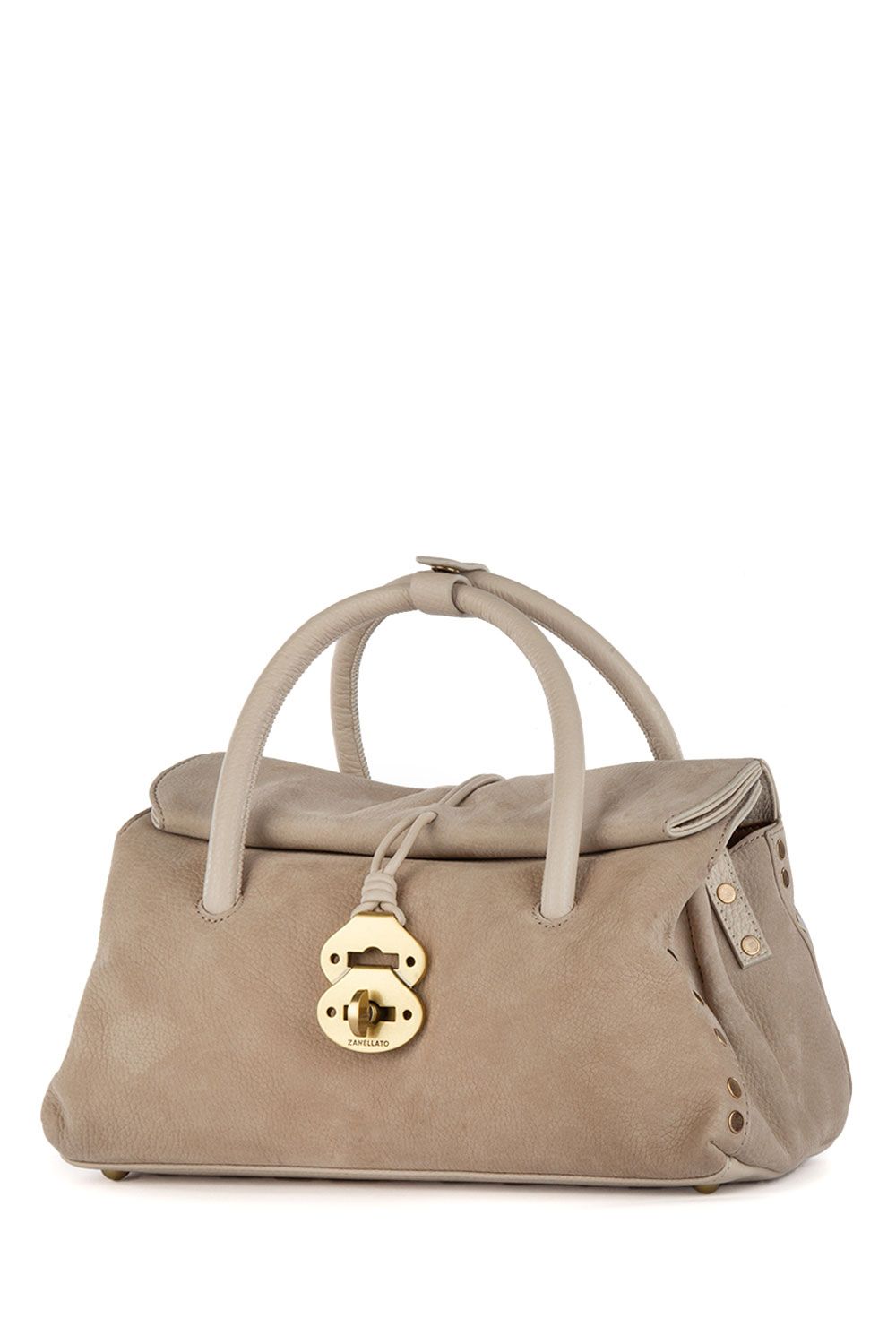 Borsa a mano in suede beige, chiusura iconica con patta magnetica, doppio manico in pelle semi rigido con chiusura ad anello con bottone automatico, doppio scomparto interno, tracolla in pelle regolabile e rimovibile