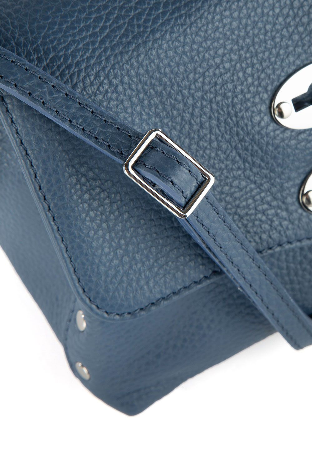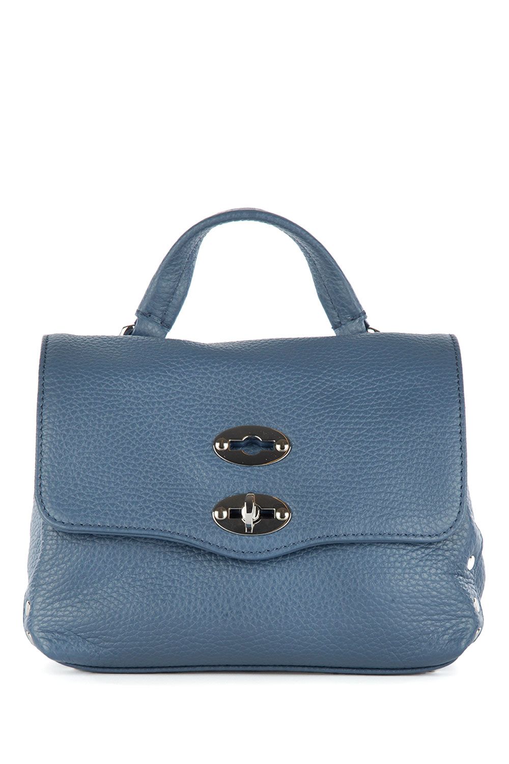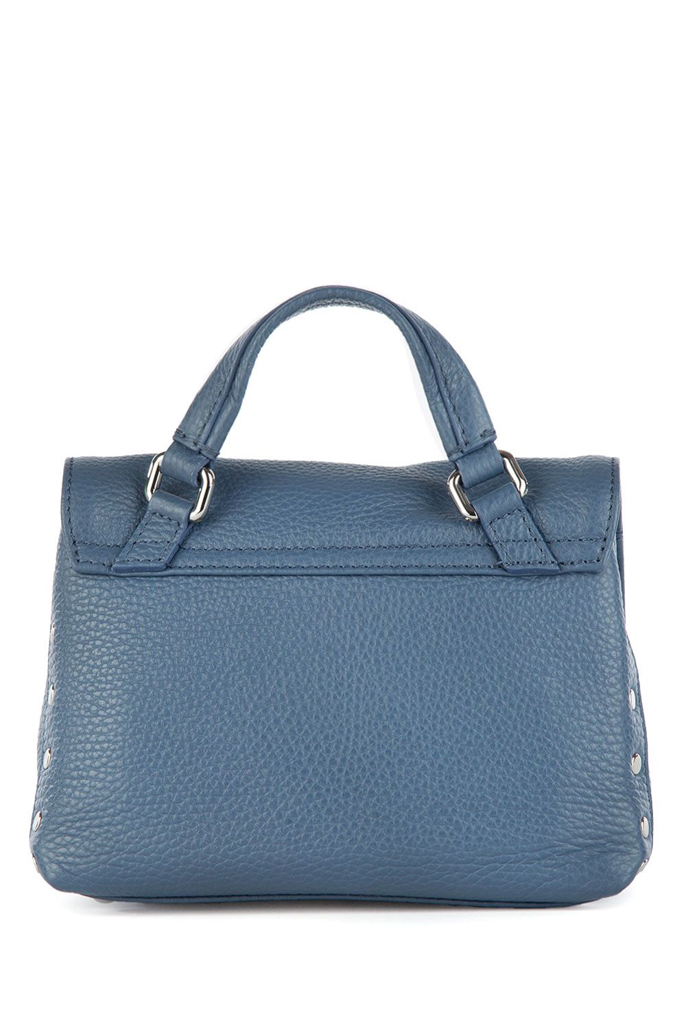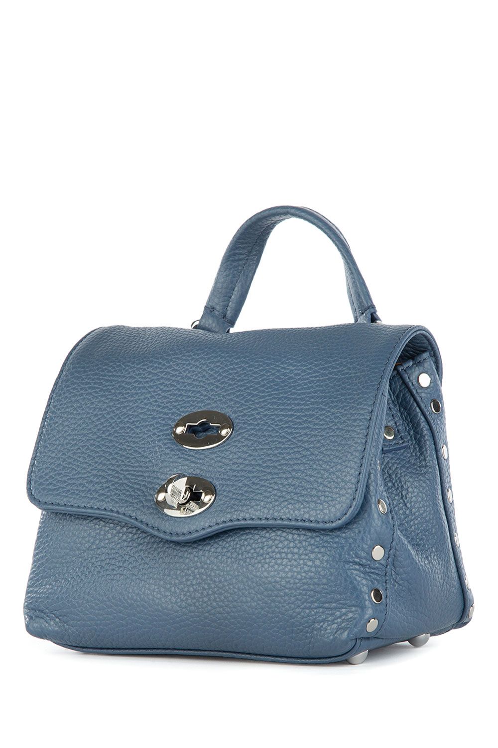 Borsa a mano baby in pelle martellata avio, patta frontale con chiusura iconica, manico semi rigido in pelle tono su tono, doppio scomparto interno e tracolla in pelle regolabile e rimovibile
