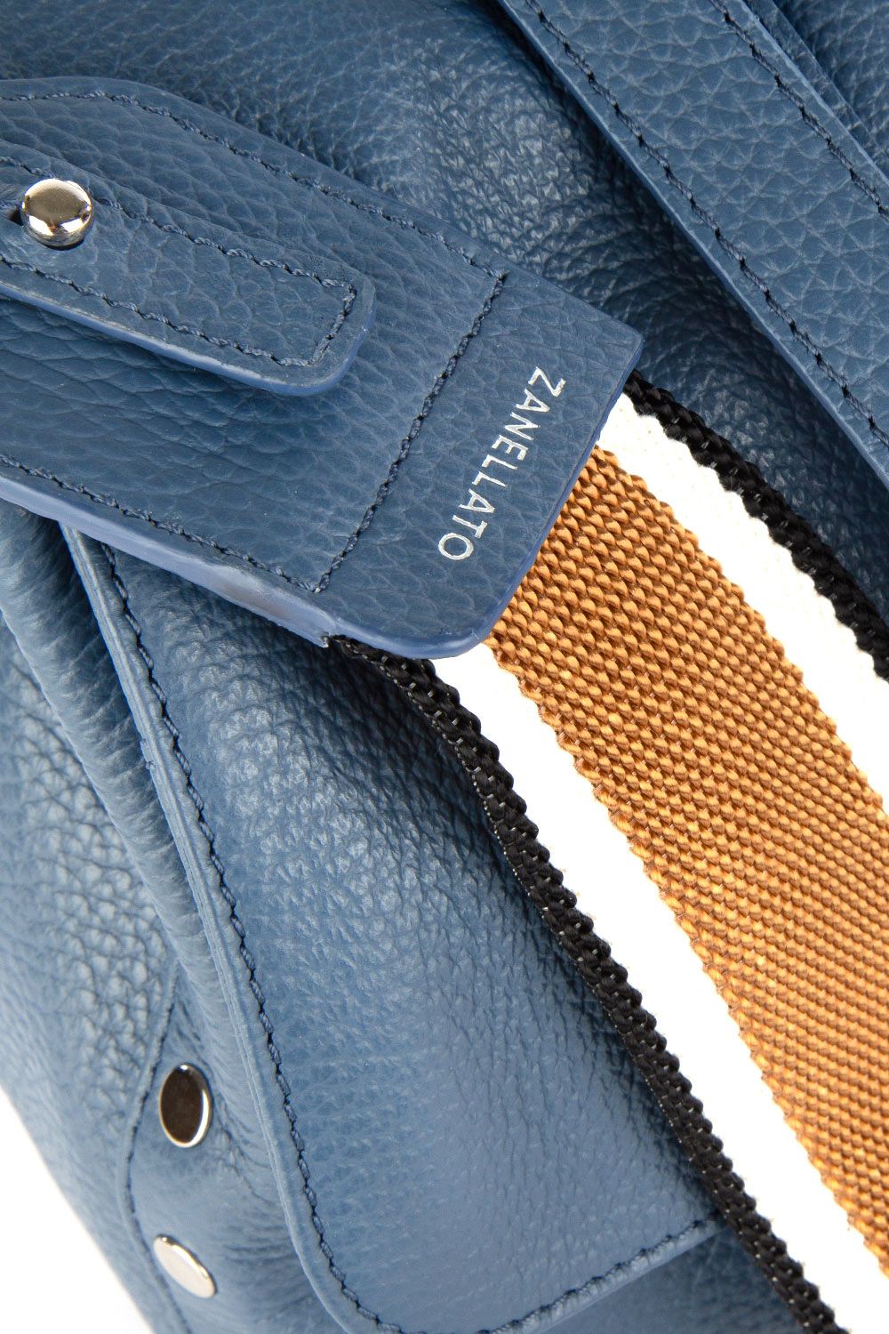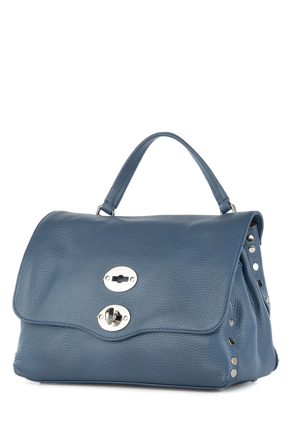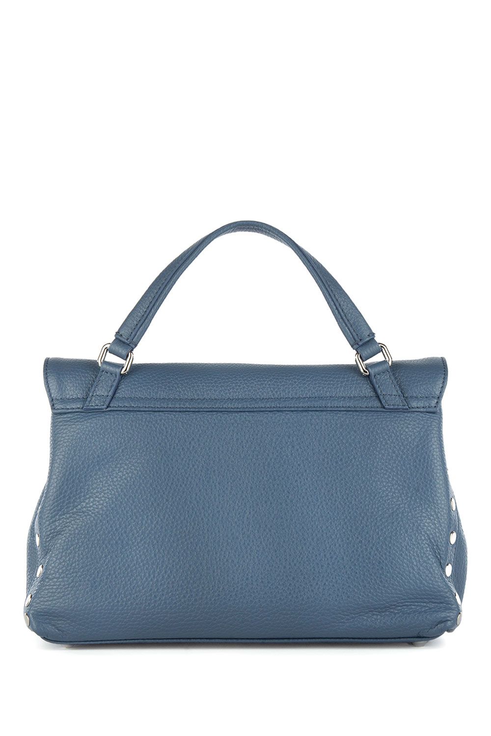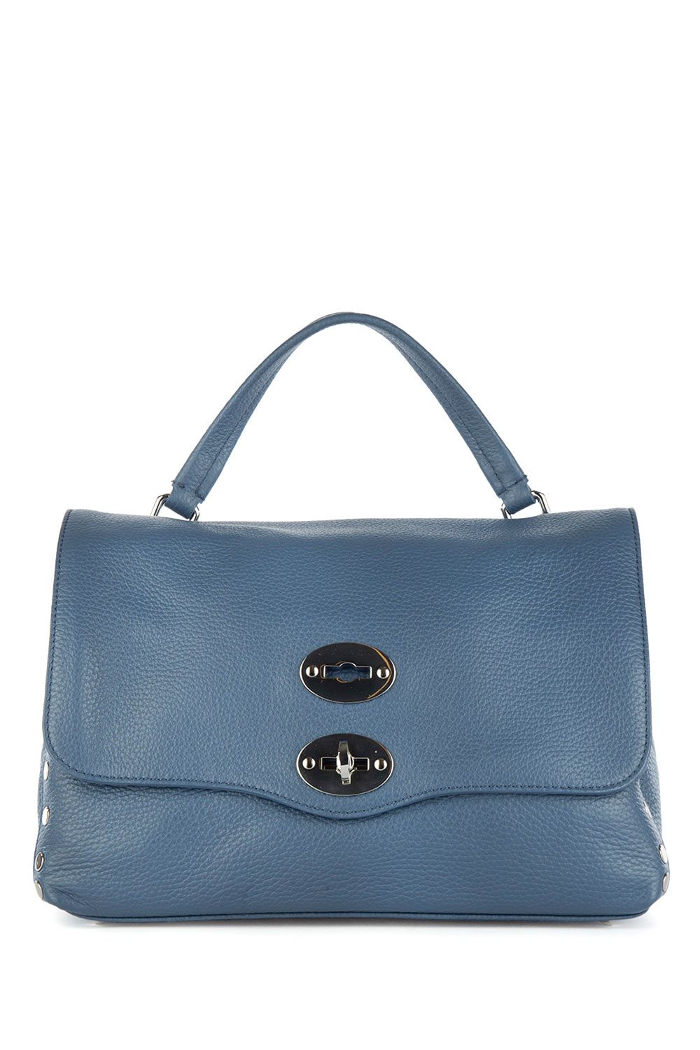 Borsa a mano in pelle martellata avio, patta frontale con chiusura iconica, manico semi rigido in pelle tono su tono, doppio scomparto interno e doppia tracolla in pelle e in tessuto sui toni del marrone bianco e nero regolabili e rimovibili