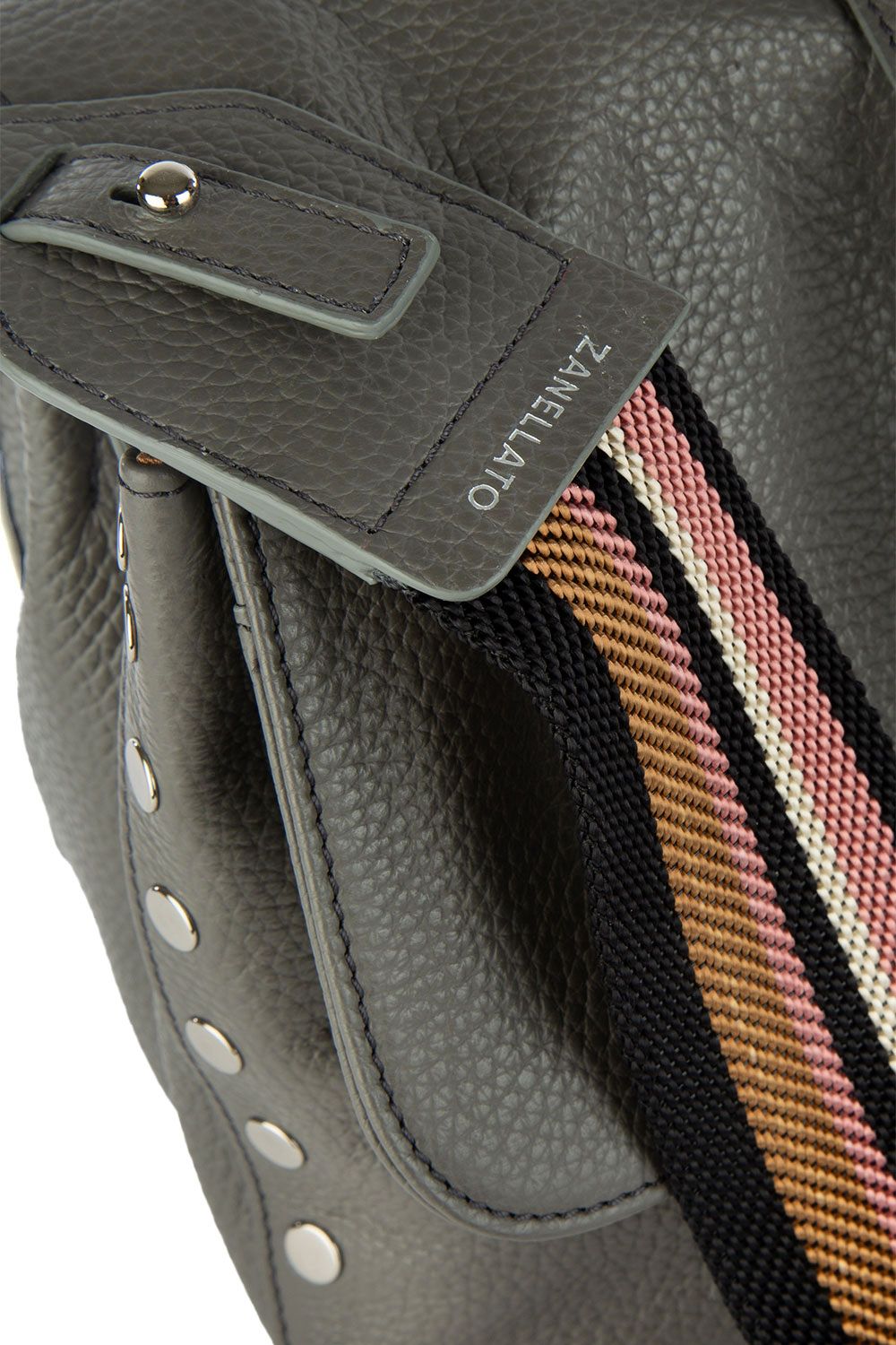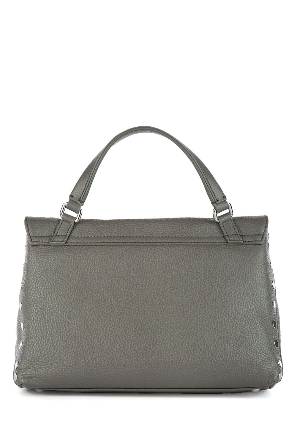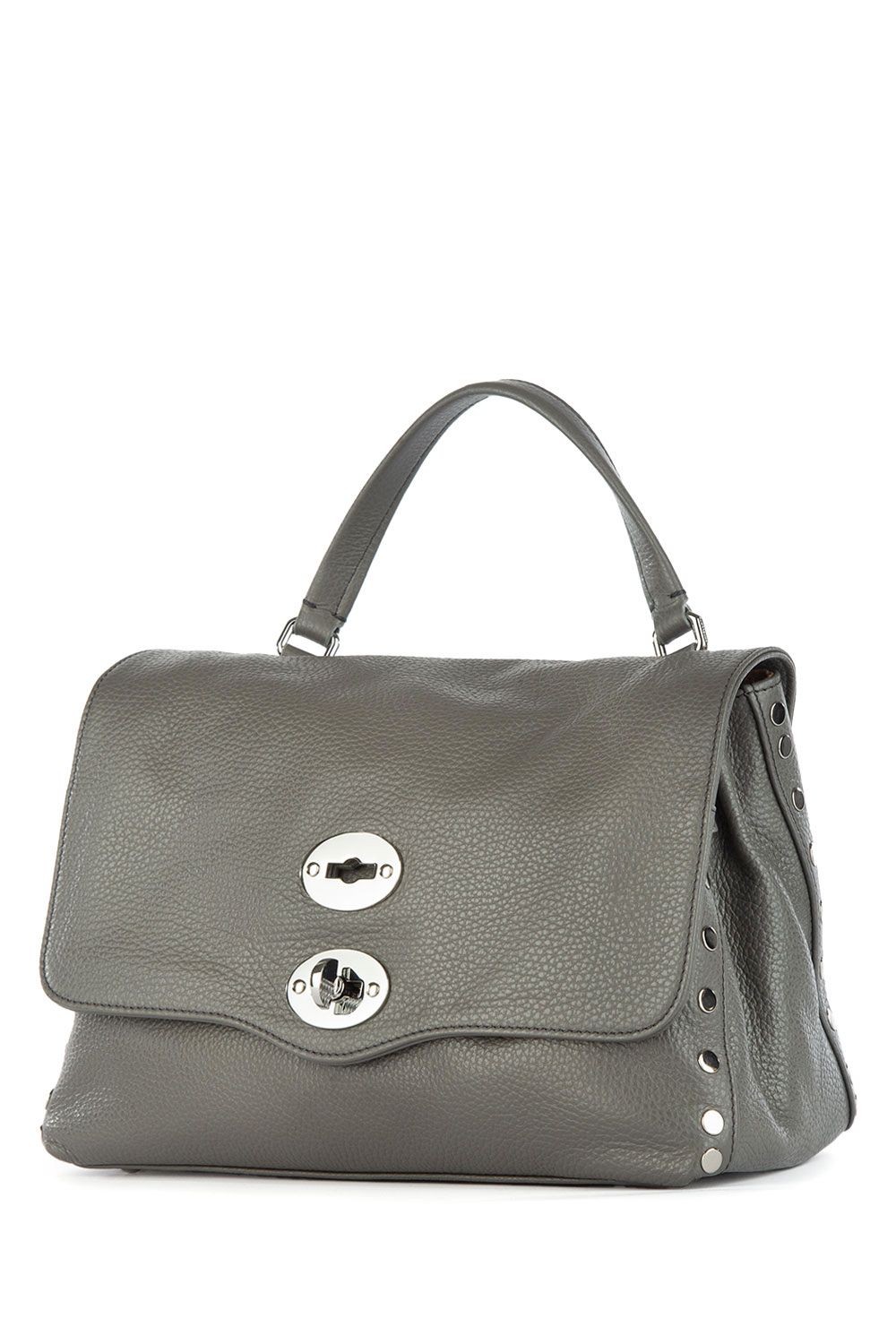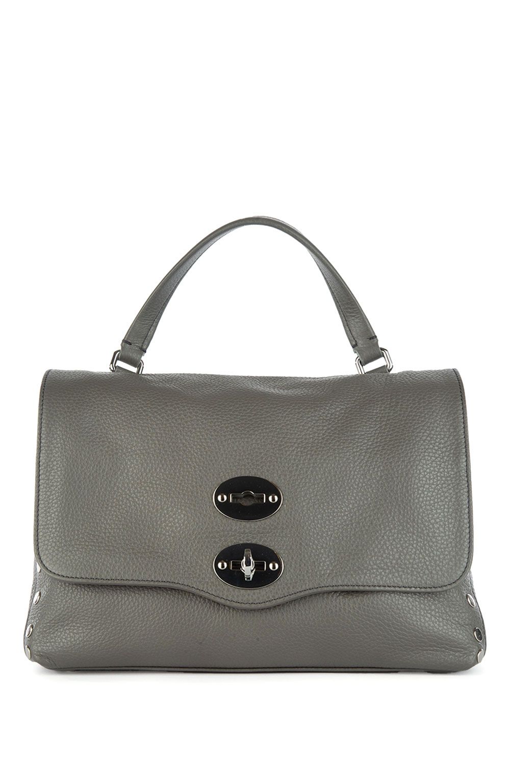 Borsa a mano in pelle martellata grigia, patta frontale con chiusura iconica, manico semi rigido in pelle tono su tono, doppio scomparto interno e doppia tracolla in pelle e in tessuto sui toni del marrone rosa e nero regolabili e rimovibili