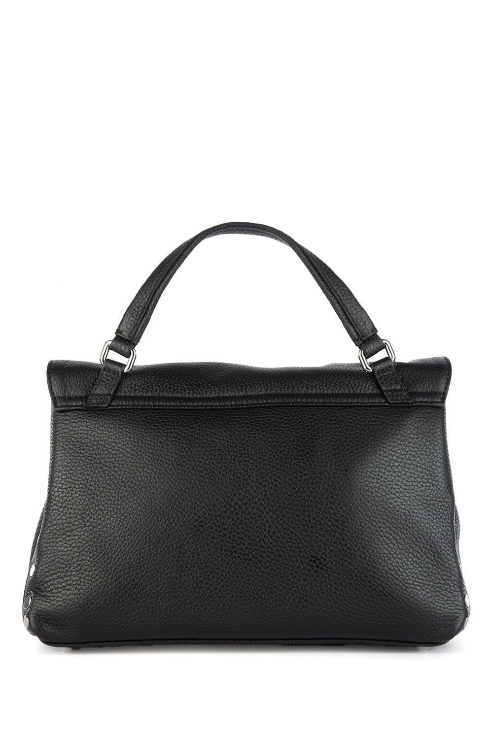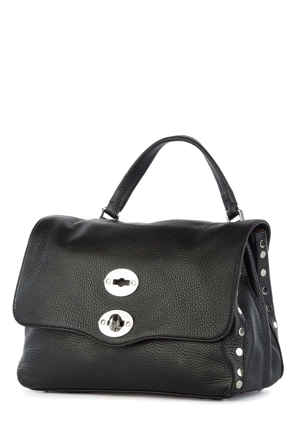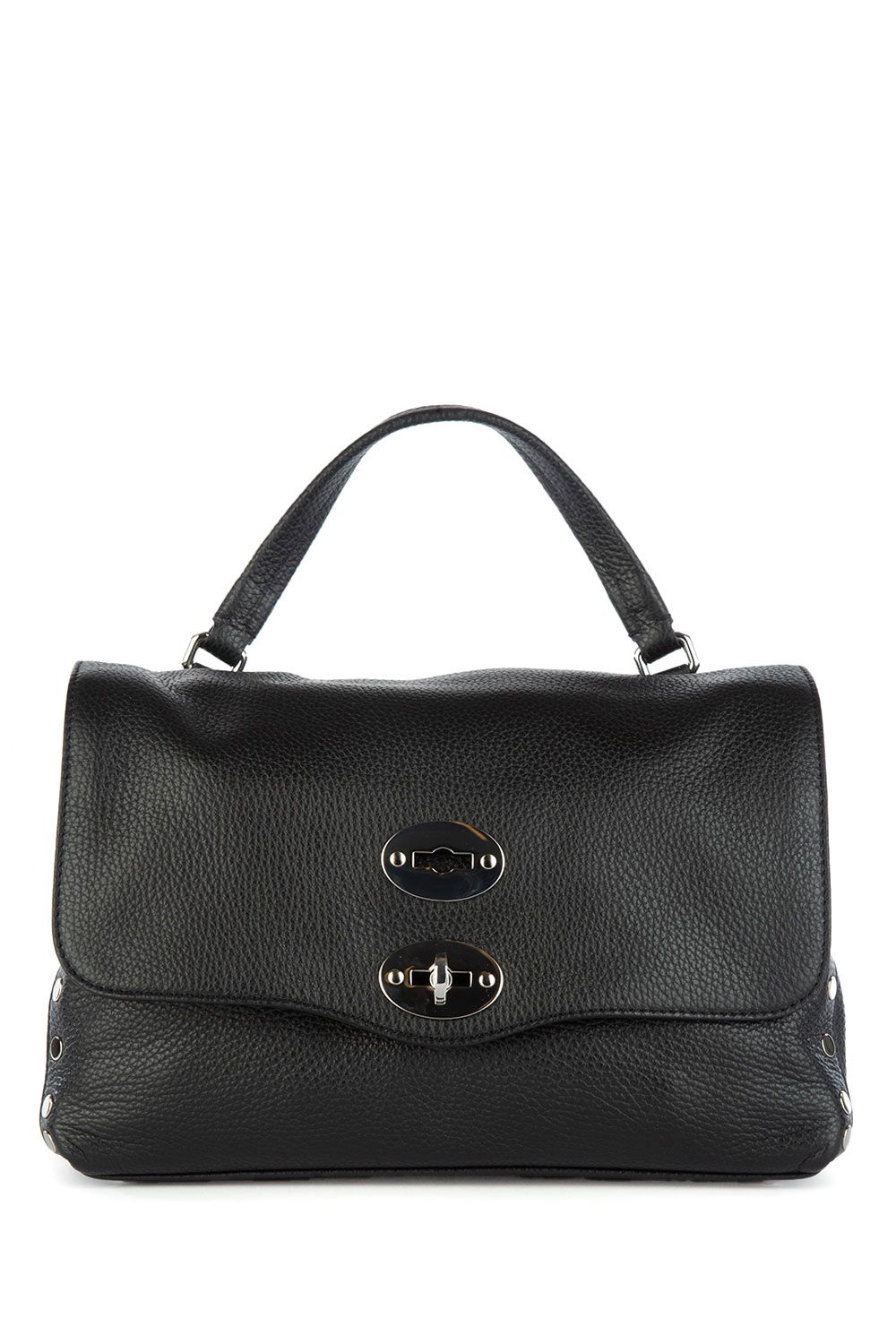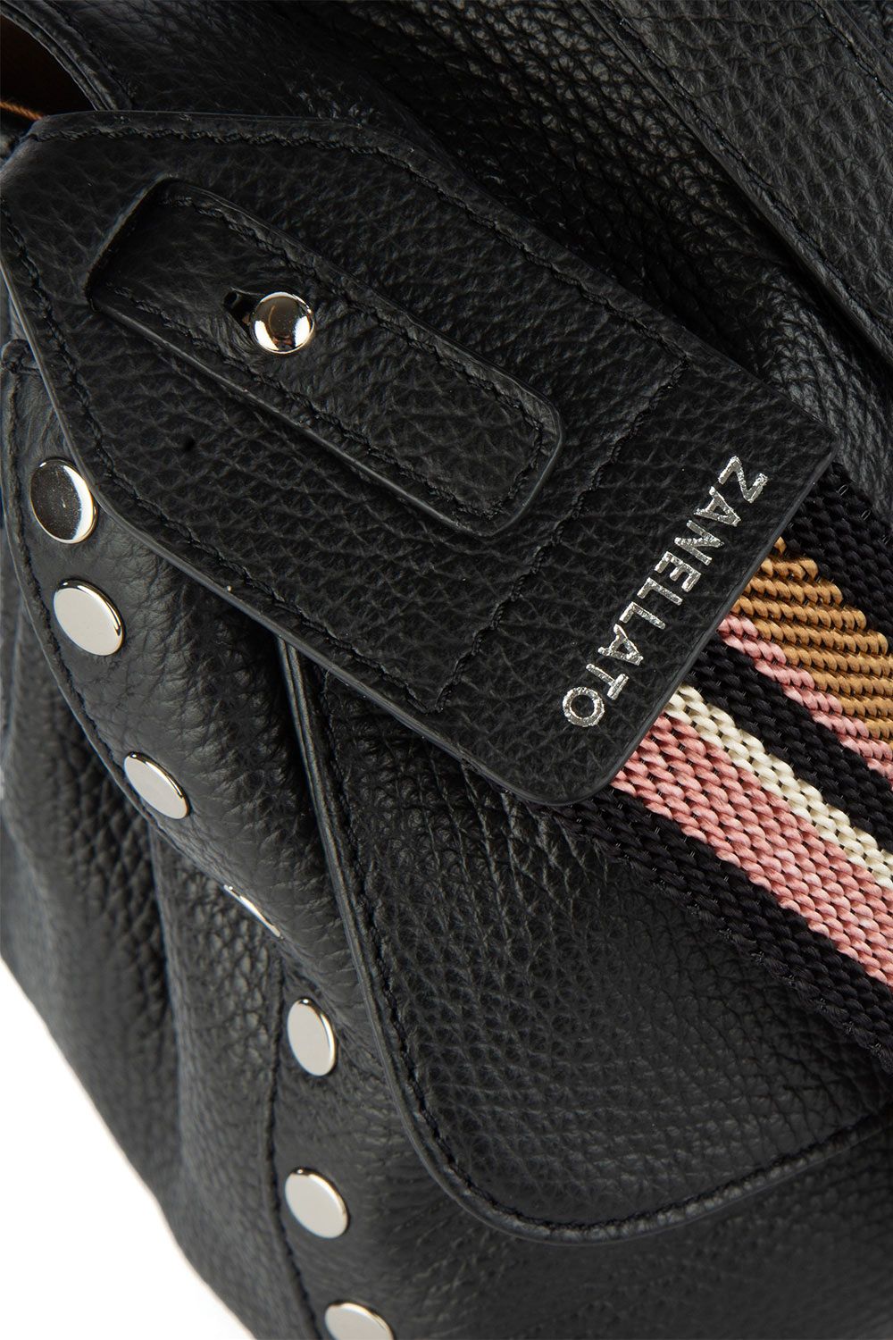 Borsa a mano in pelle martellata nera, patta frontale con chiusura iconica, manico semi rigido in pelle tono su tono, doppio scomparto interno e doppia tracolla in pelle e in tessuto sui toni del marrone rosa e nero regolabili e rimovibili