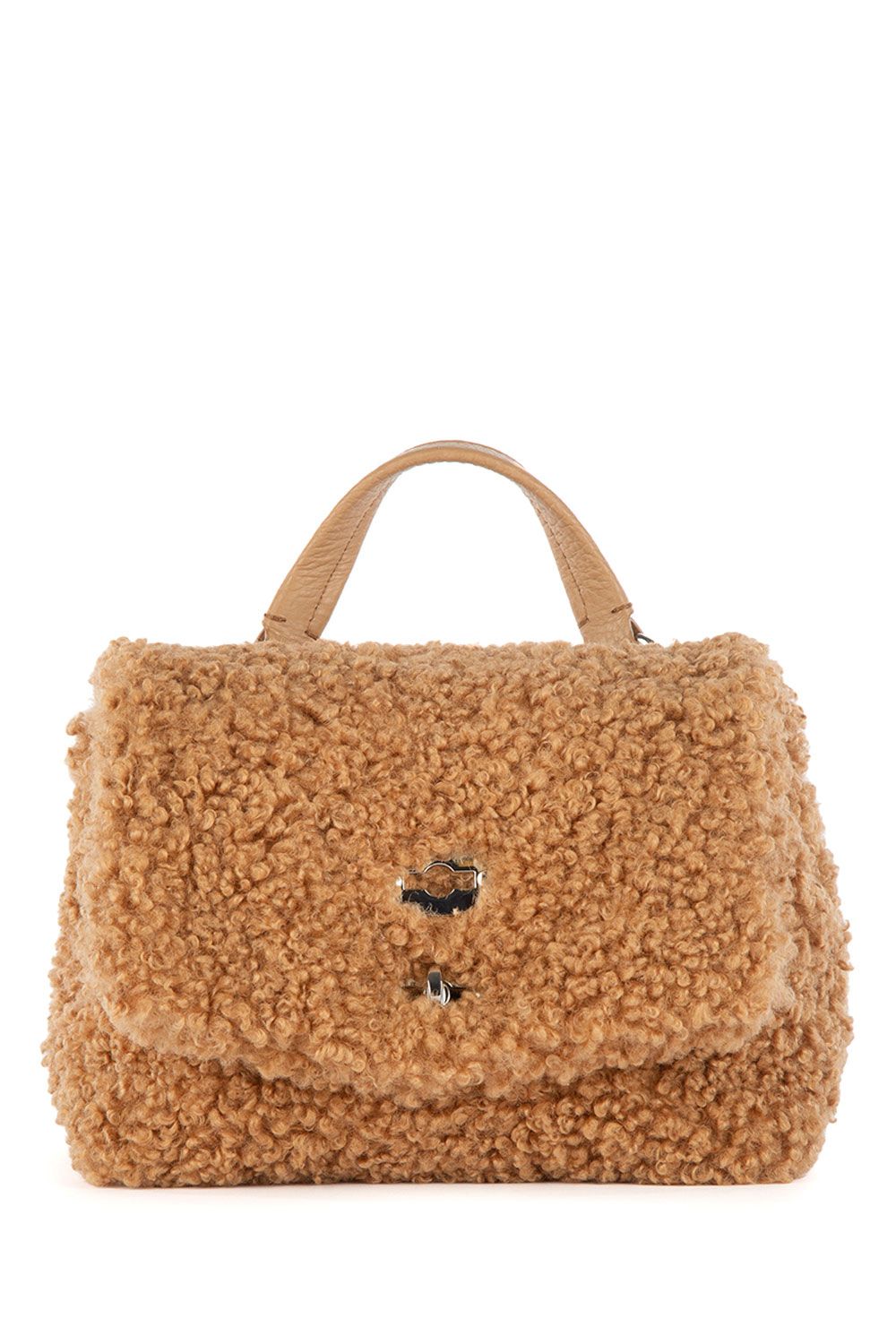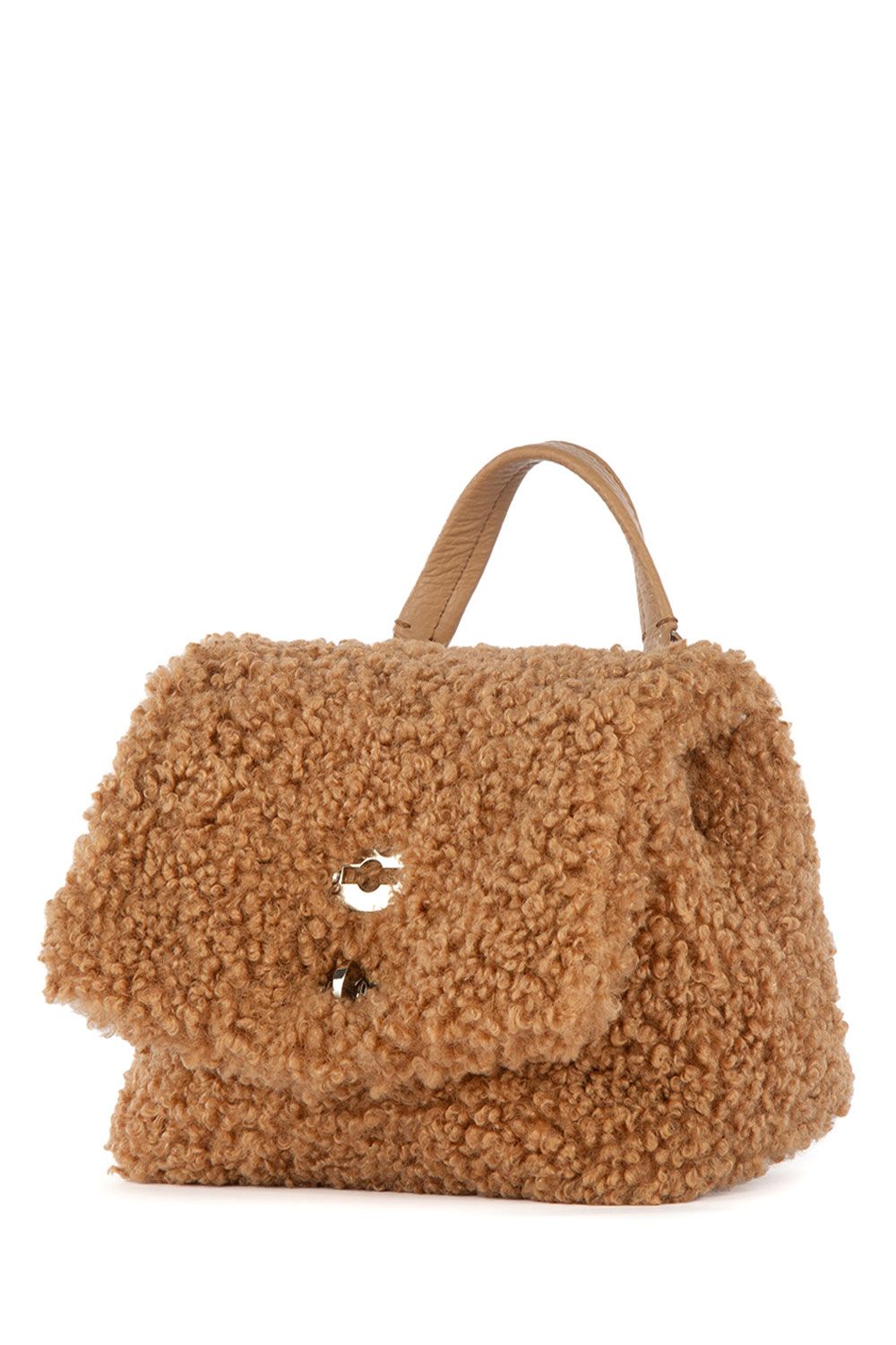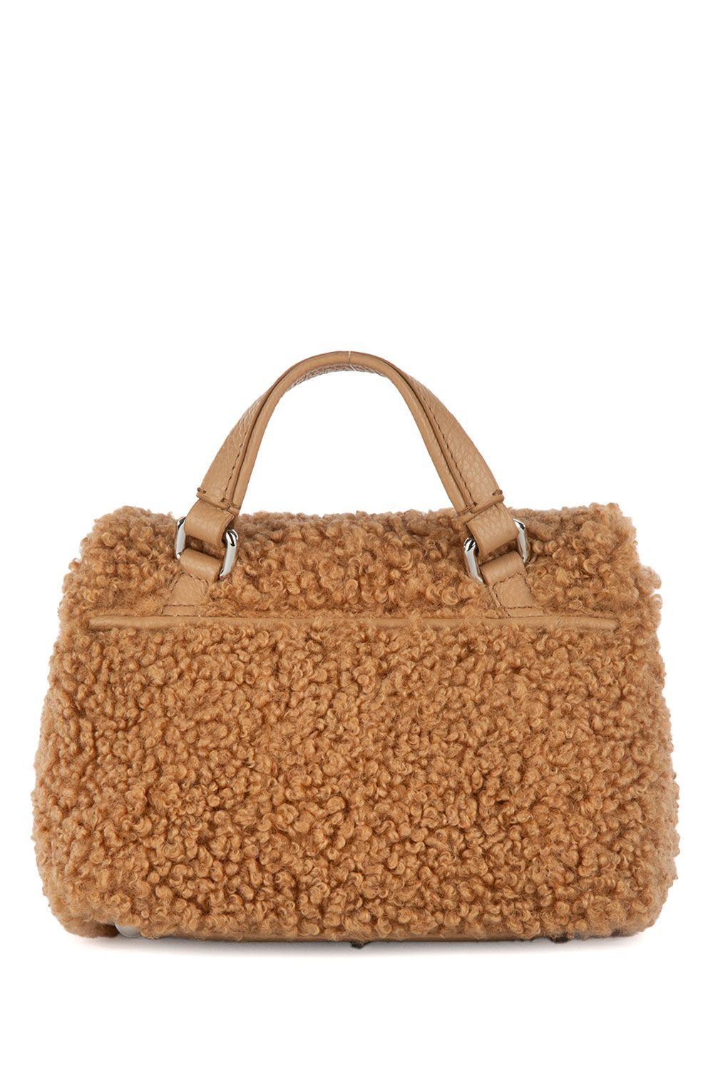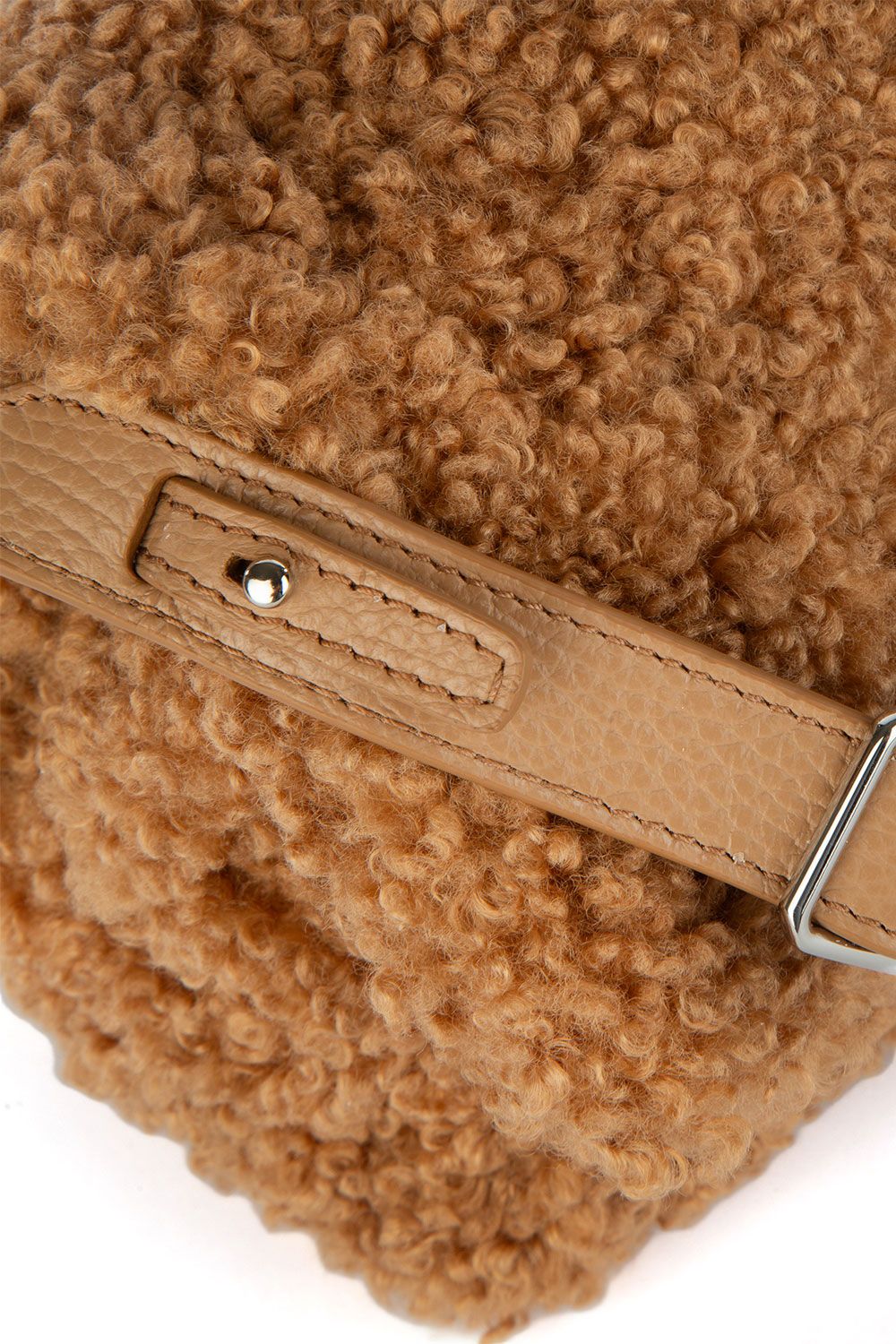 Borsa a mano baby in pelle trama shearling cammello, patta frontale con chiusura iconica, manico semi rigido in pelle tono su tono, doppio scomparto interno e tracolla in pelle regolabile e rimovibile