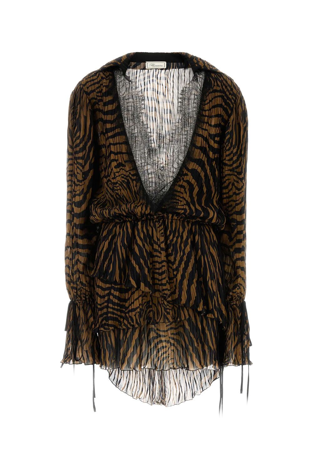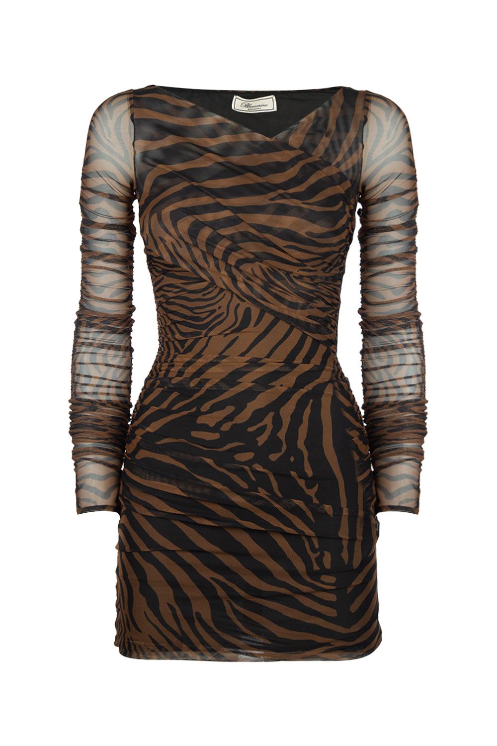 Abito corto in chiffon plissettato stampa zebra con inserti in pizzo nero con scollo a V, vita elasticata e maniche lunghe ampie con polsini con coulisse