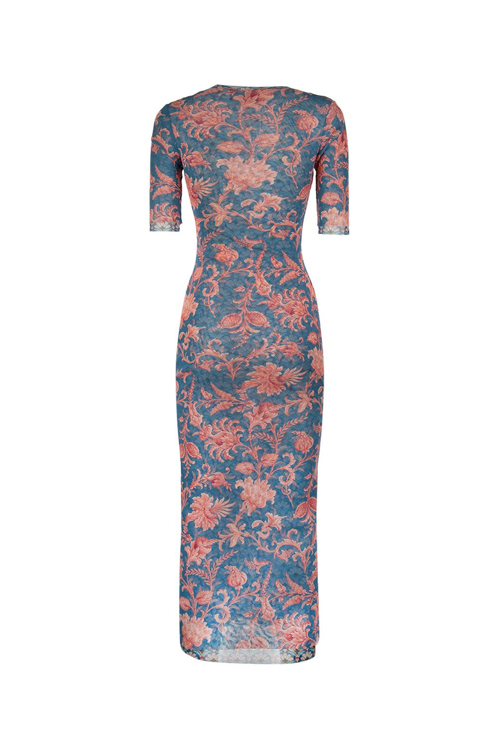 Abito midi in tulle stretch stampa floreale con scollo a V e maniche corte