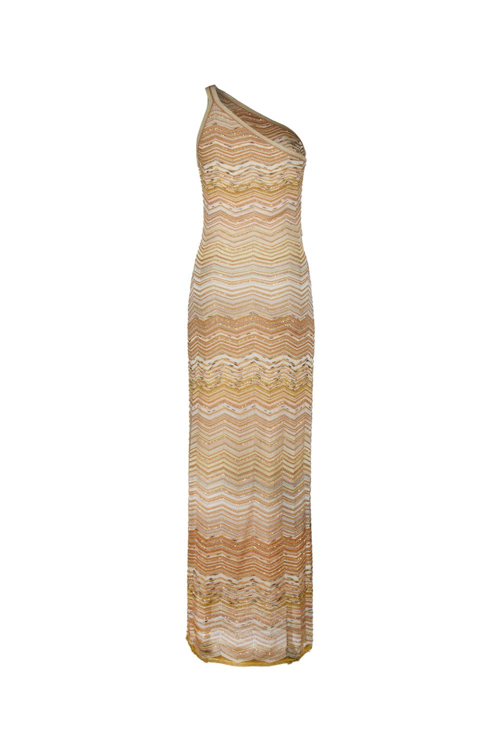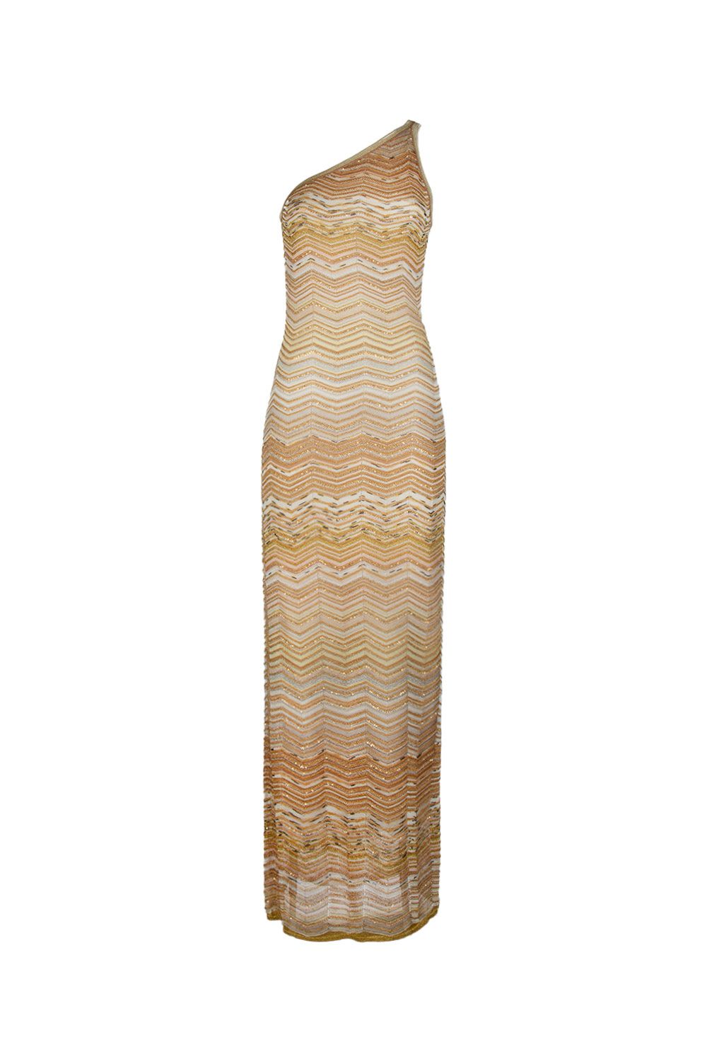 Abito lungo monospalla in viscosa chevron lamé dorato con paillettes