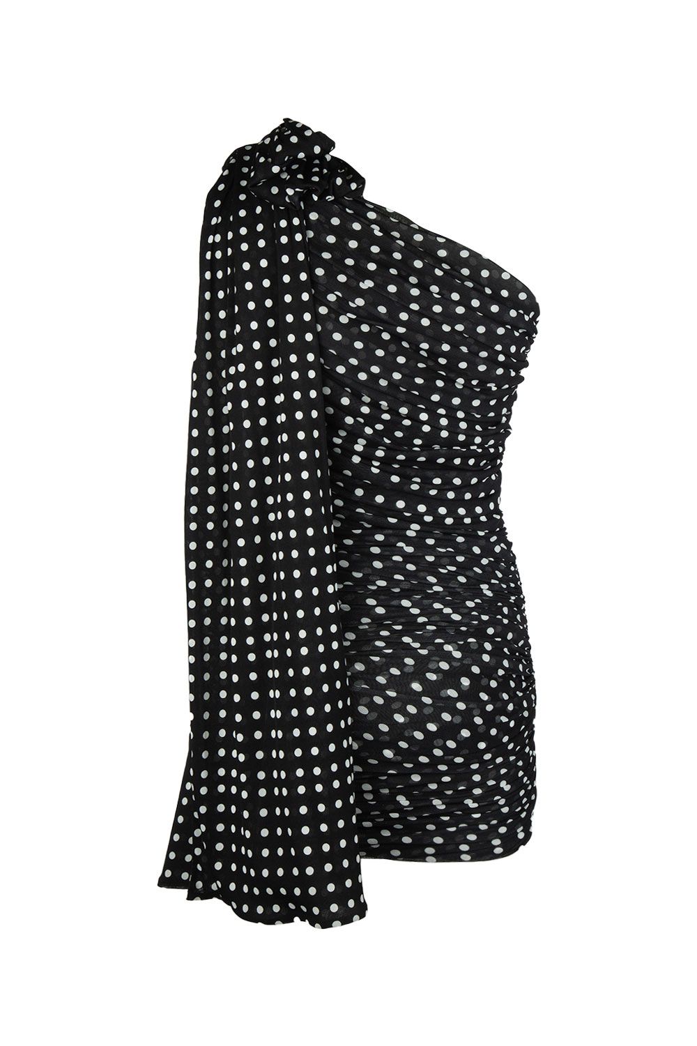 Abito corto asimmetrico in tulle a pois bianchi arricciato con fiocco sulla spalla