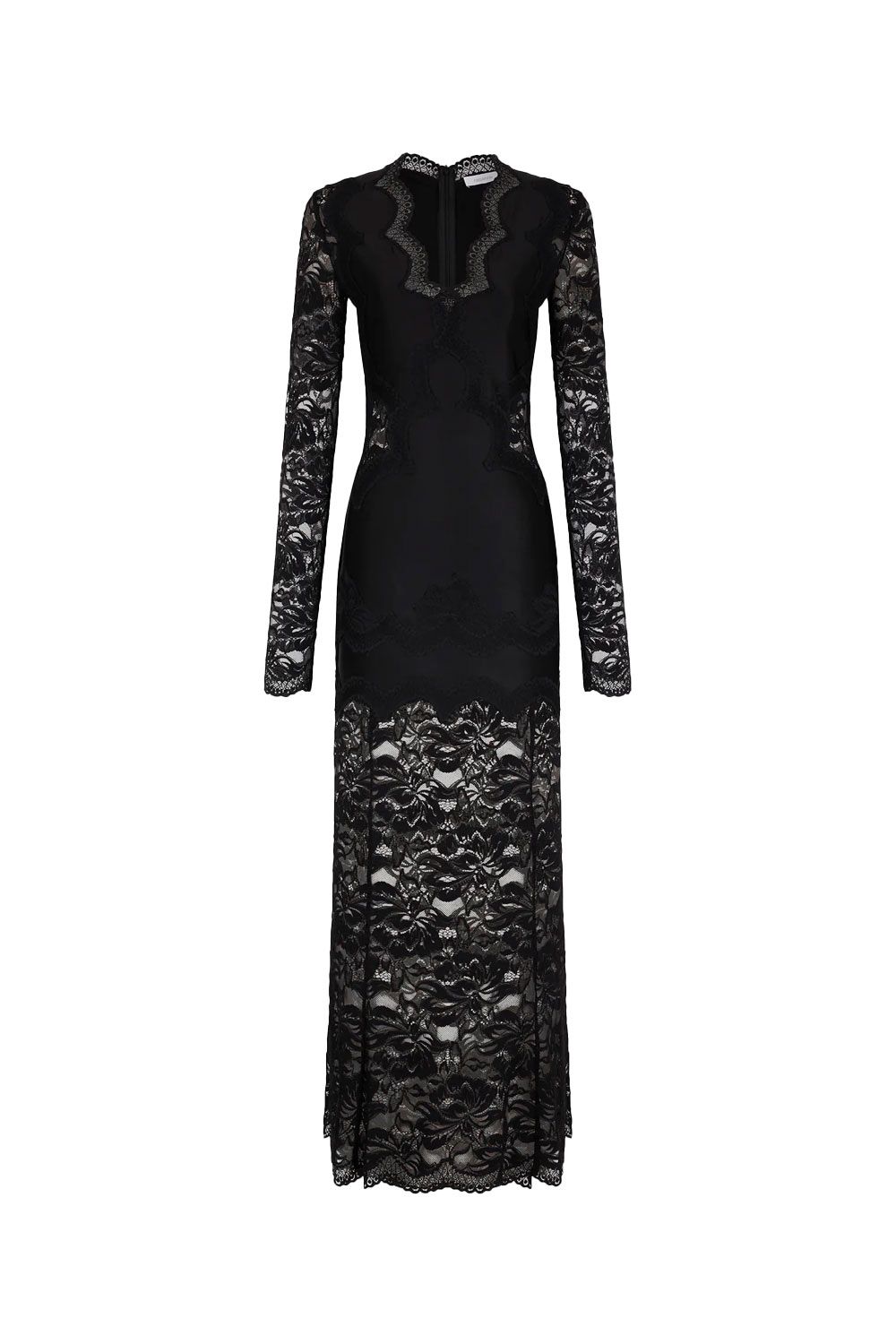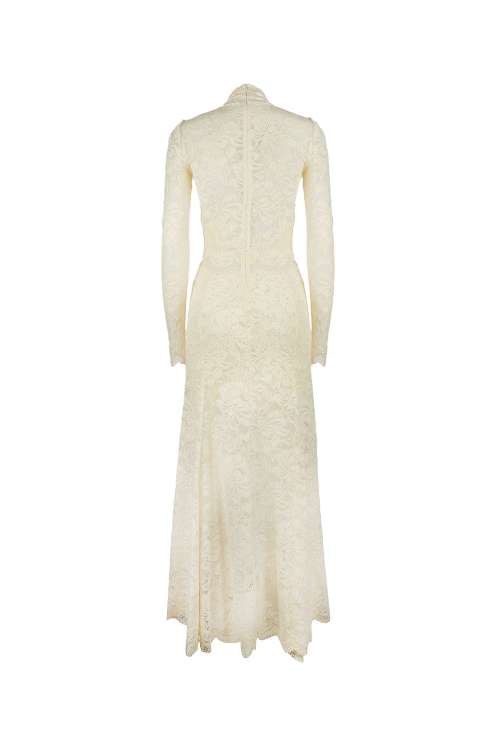 Abito lungo in pizzo panna con collo incrociato e maniche lunghe