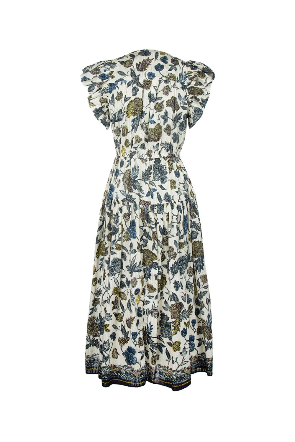 Abito midi in mussola di cotone stampa floreale con vita elasticata, tasche laterali, scollo a V, maniche ad aletta e gonna ampia