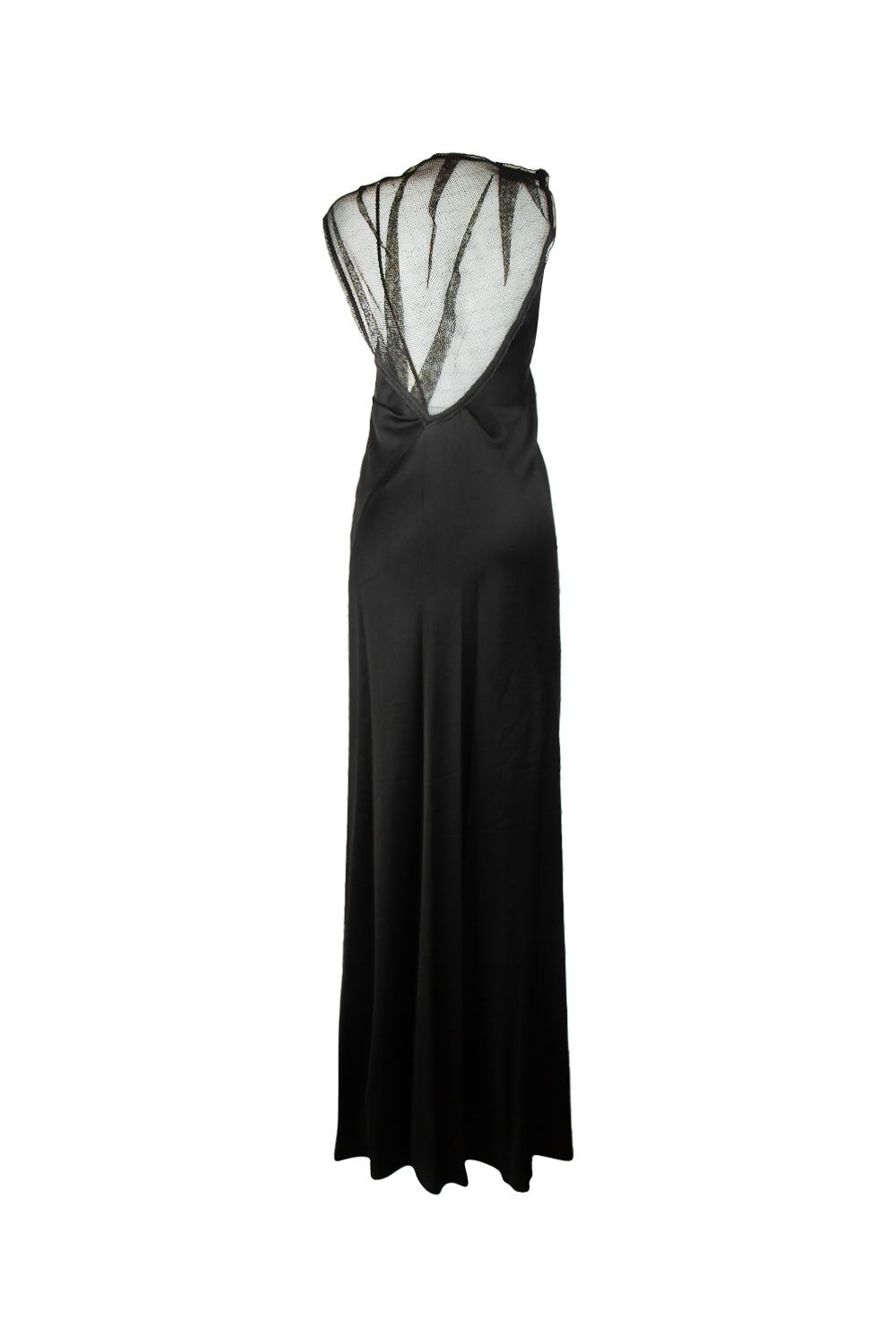 Abito lungo in crepe nero con inserti in mesh tono su tono sul corpetto