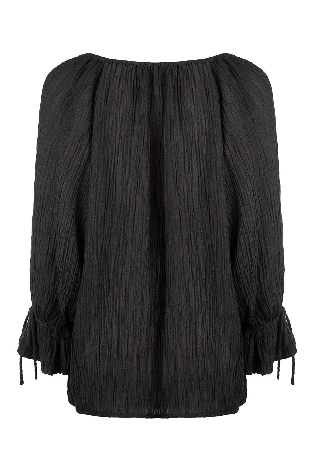 Blusa in garza nera effetto plissettato con scollo con coulisse e maniche lunghe ampie con polsini elasticati