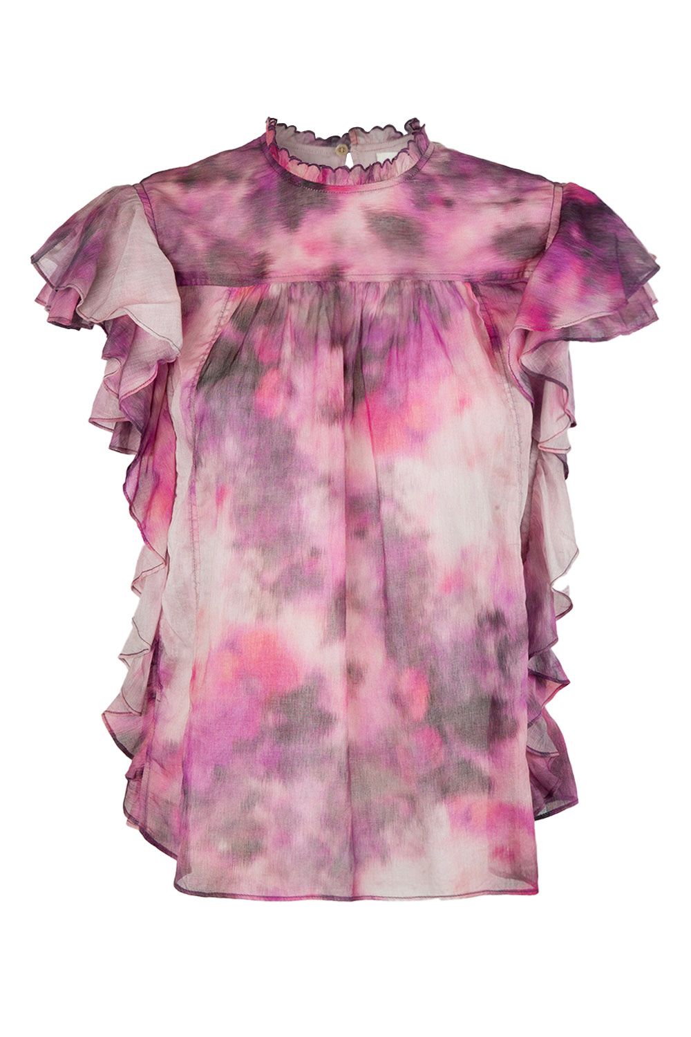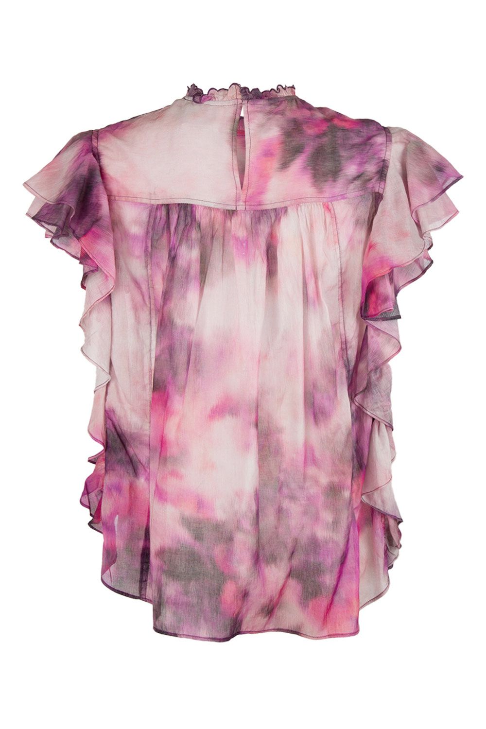Blusa in mussola di cotone stampa tie dye rosa con volant sui lati ed apertura con goccia nella parte posteriore