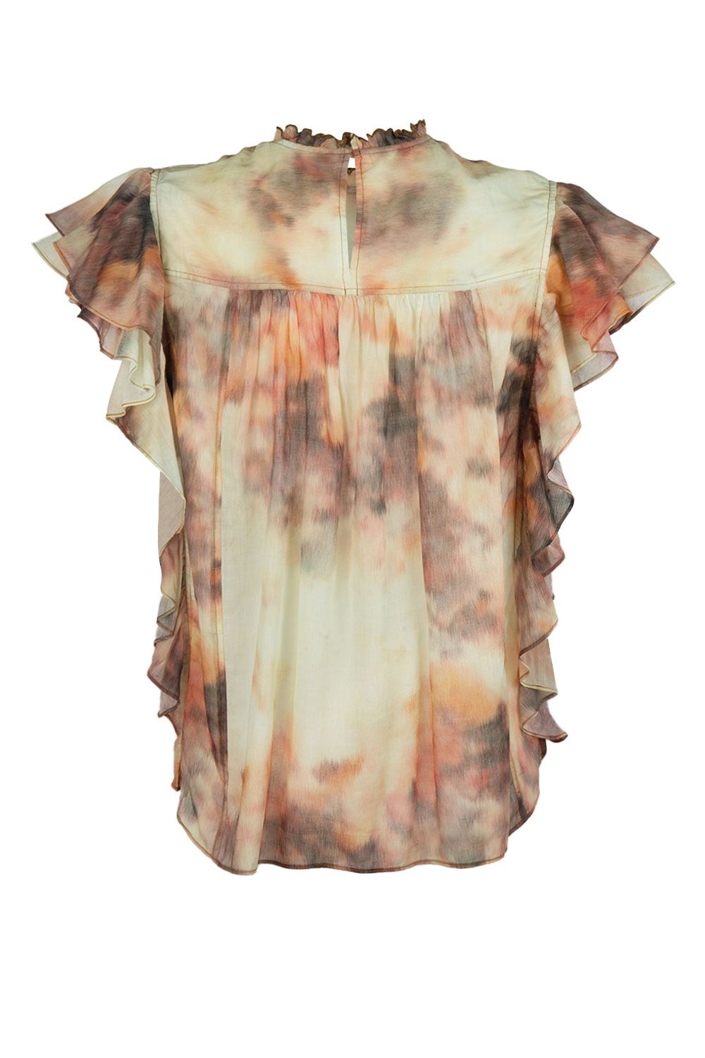 Blusa in mussola di cotone stampa tie dye beige con volant sui lati ed apertura con goccia nella parte posteriore