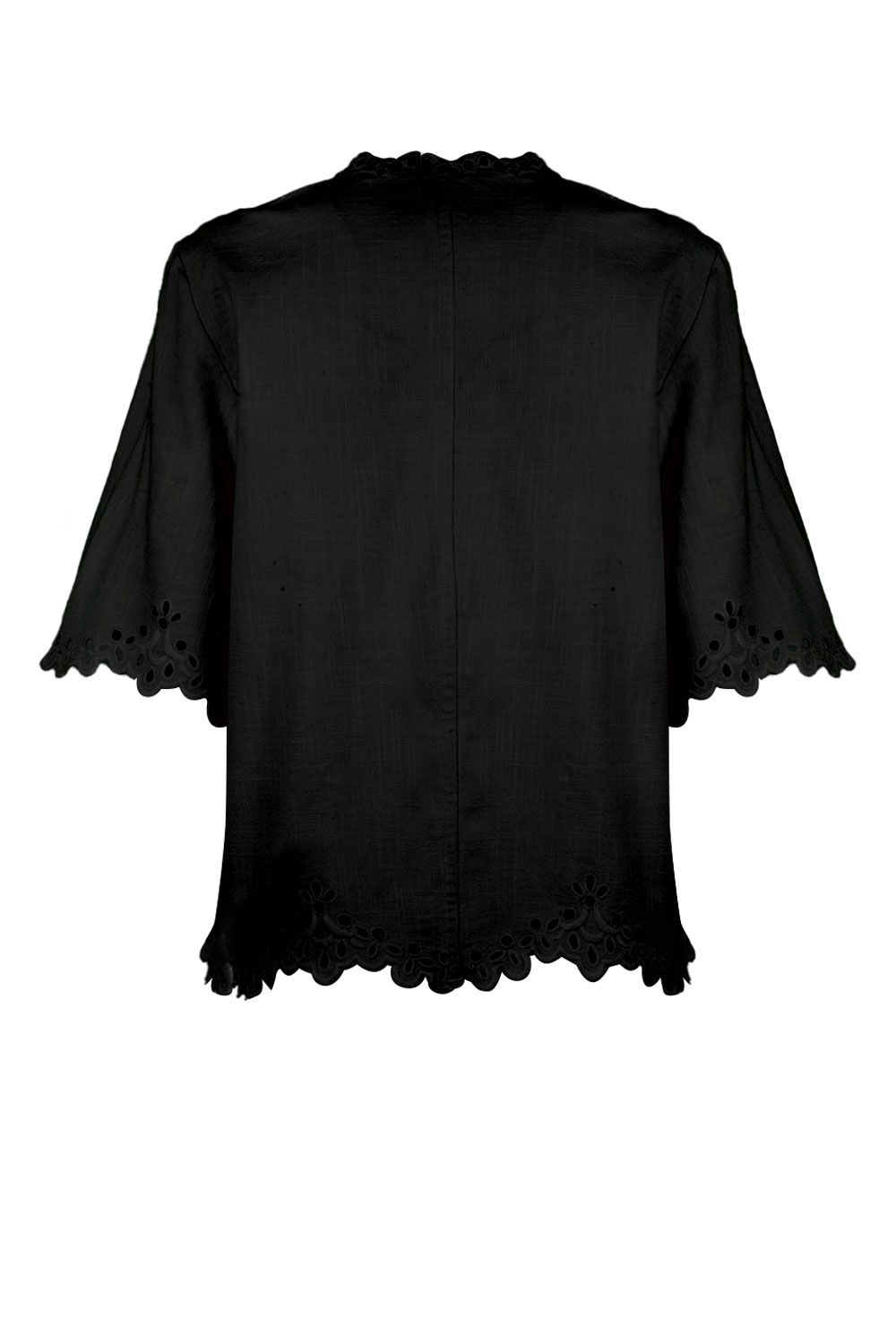 Blusa in cotone nera con scollo a V decorata con sangallo