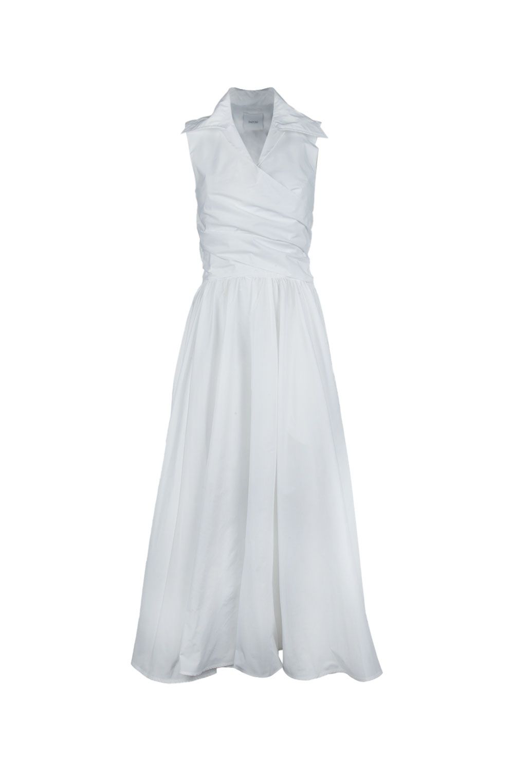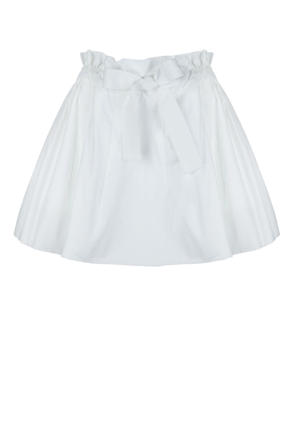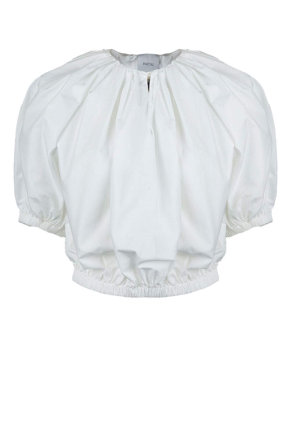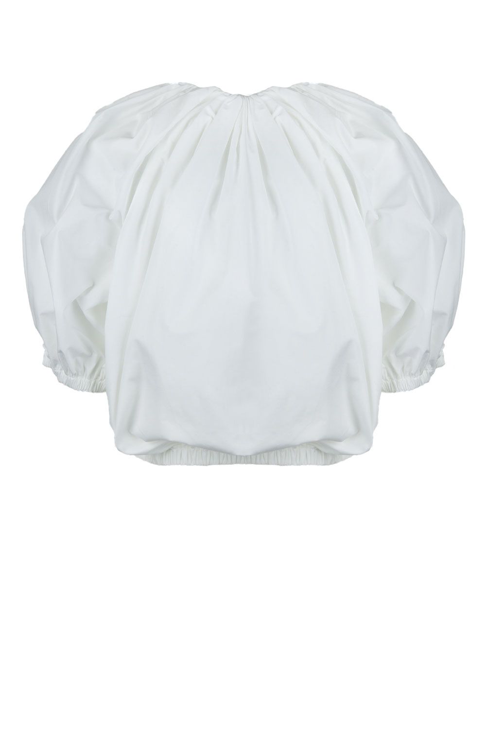 Blusa girocollo in popeline di cotone bianca con maniche corte a sbuffo, vita elasticata e taglio nella parte frontale