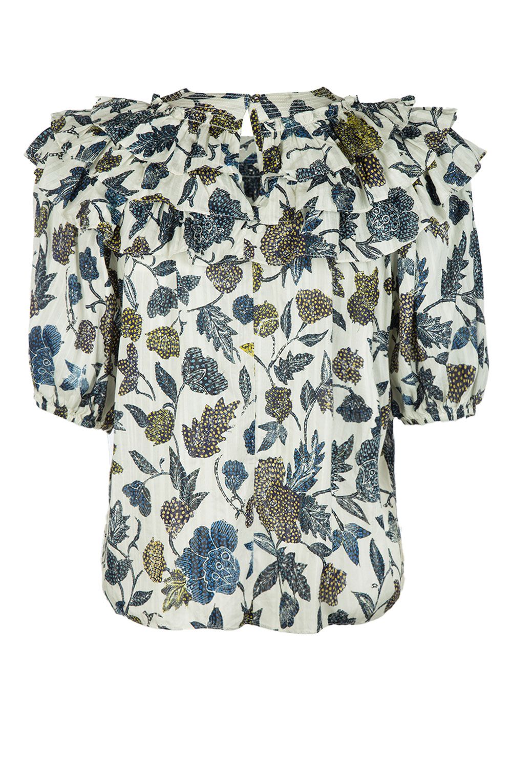 Blusa girocollo in mussola di cotone stampa floreale con ruches sullo scollo, maniche corte ed apertura con goccia nella parte posteriore