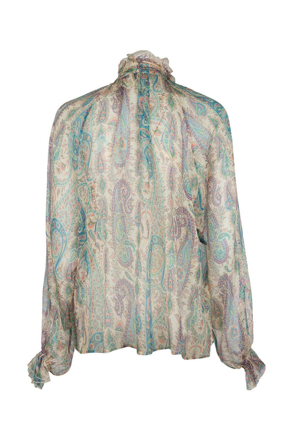 Blusa in crepon di seta stampa Paisley con maniche lunghe con polsini elasticati e ruches e colletto con ruches