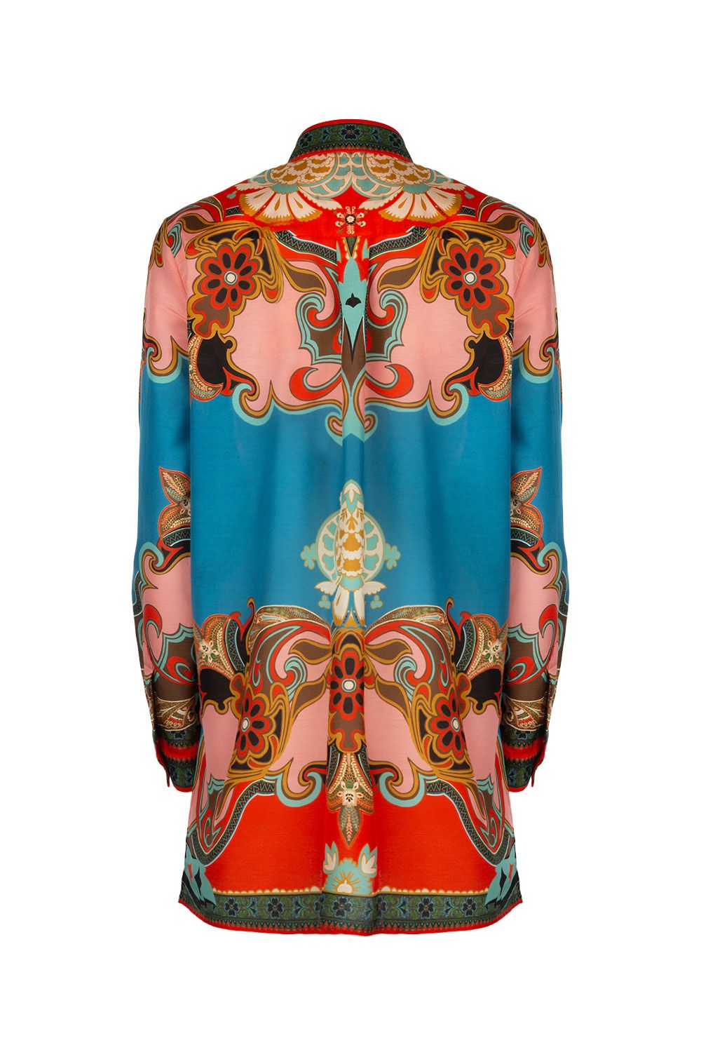 Camicia lunga in mussola di cotone e seta stampa floreale astratta con apertura frontale con bottoni, colletto classico e maniche lunghe con polsini