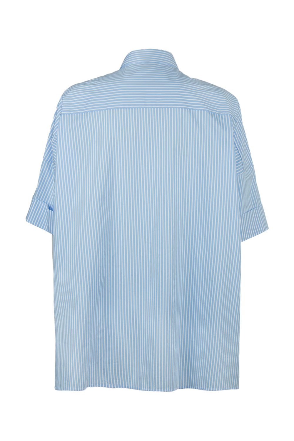 Camicia oversize in popeline di cotone stretch azzurra a righe bianca con colletto classico, apertura frontale con bottoni nascosti, maniche corte con risvolto e fondo asimmetrico con spacchi laterali