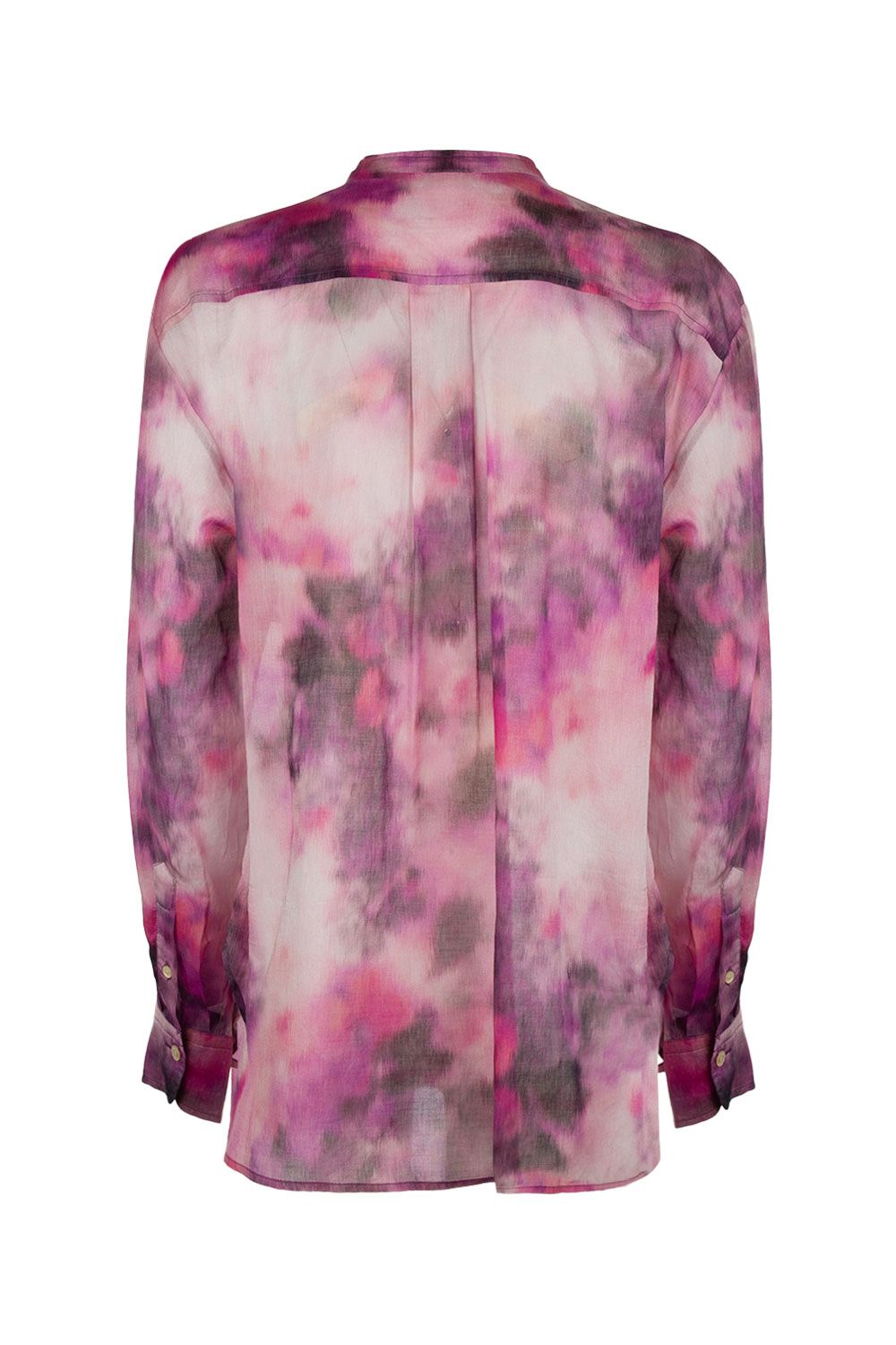 Camicia in mussola di cotone stampa tie dye rosa con apertura frontale con bottoni, colletto alla coreana e maniche lunghe con polsini