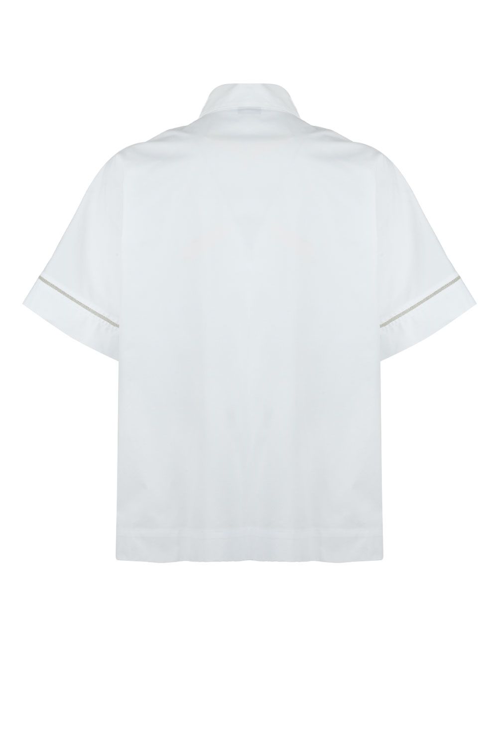 Camicia in popeline di cotone bianca a maniche corte impreziosite da punto luce, colletto classico ed apertura frontale con bottoni nascosti