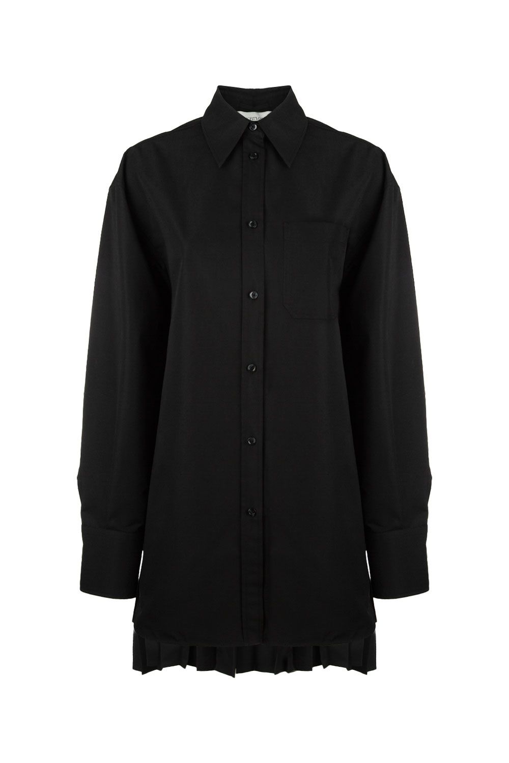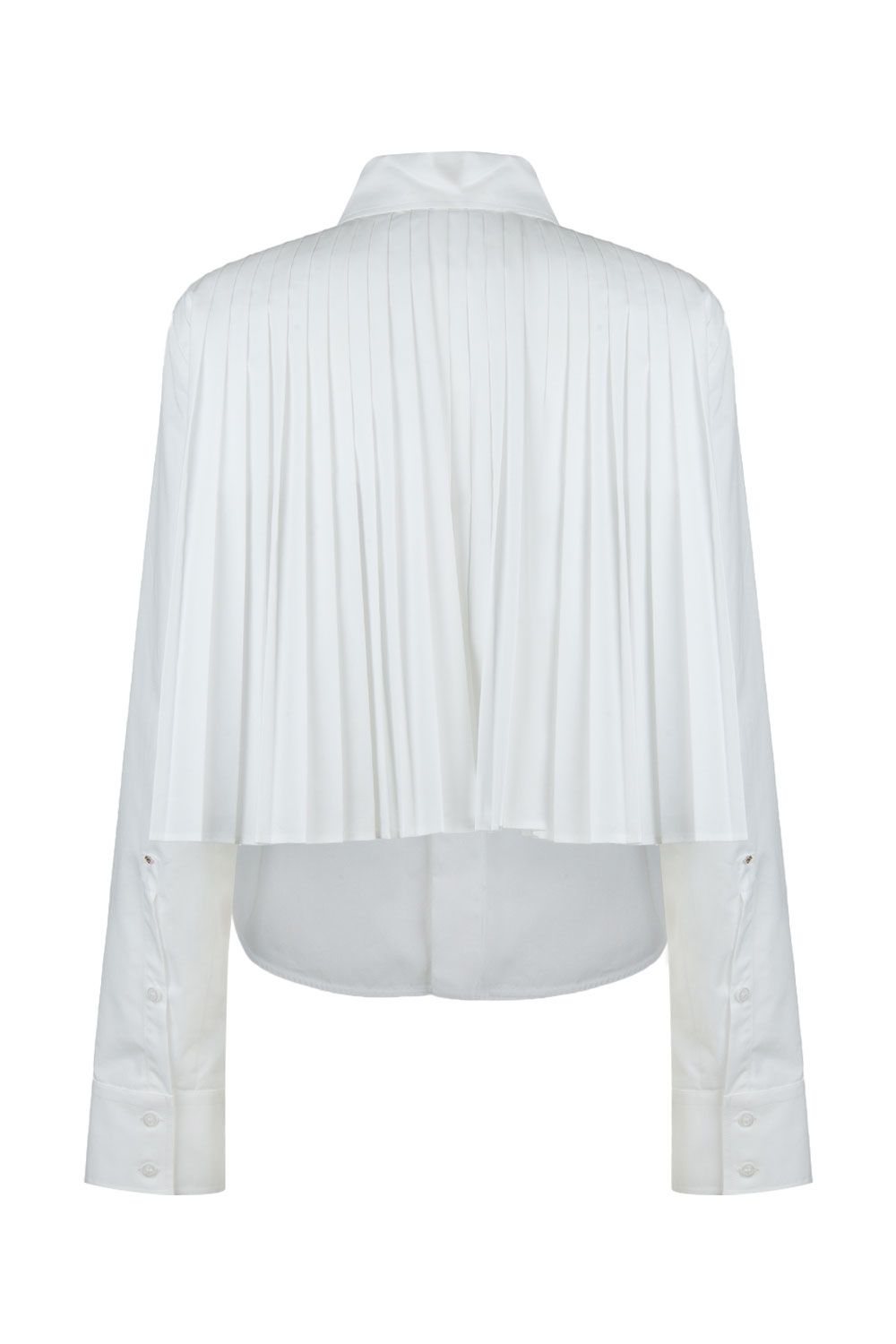 Camicia crop in popeline di cotone bianca con colletto classico, apertura frontale con bottoni nascosti, maniche lunghe con polsini e parte posteriore plissettata