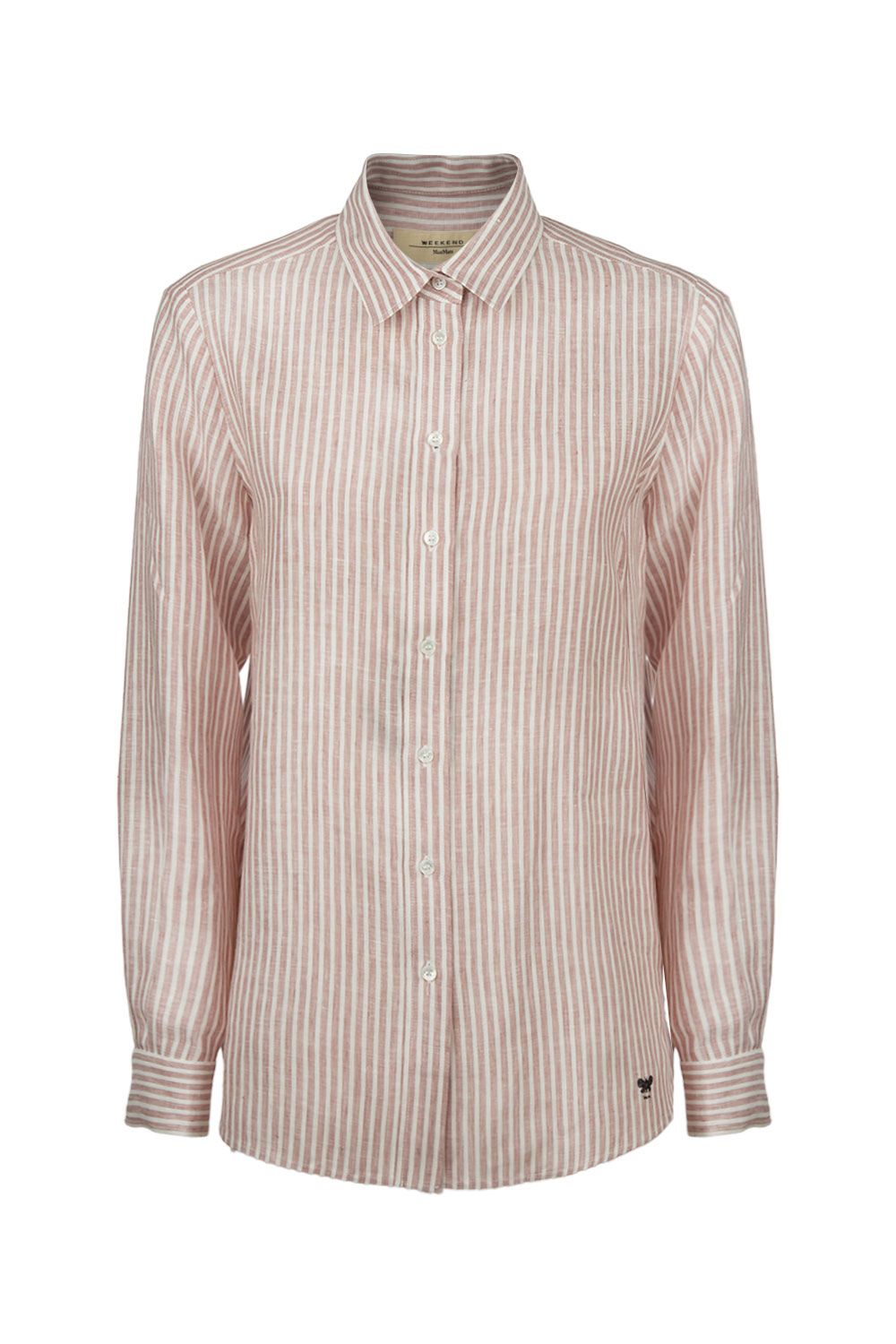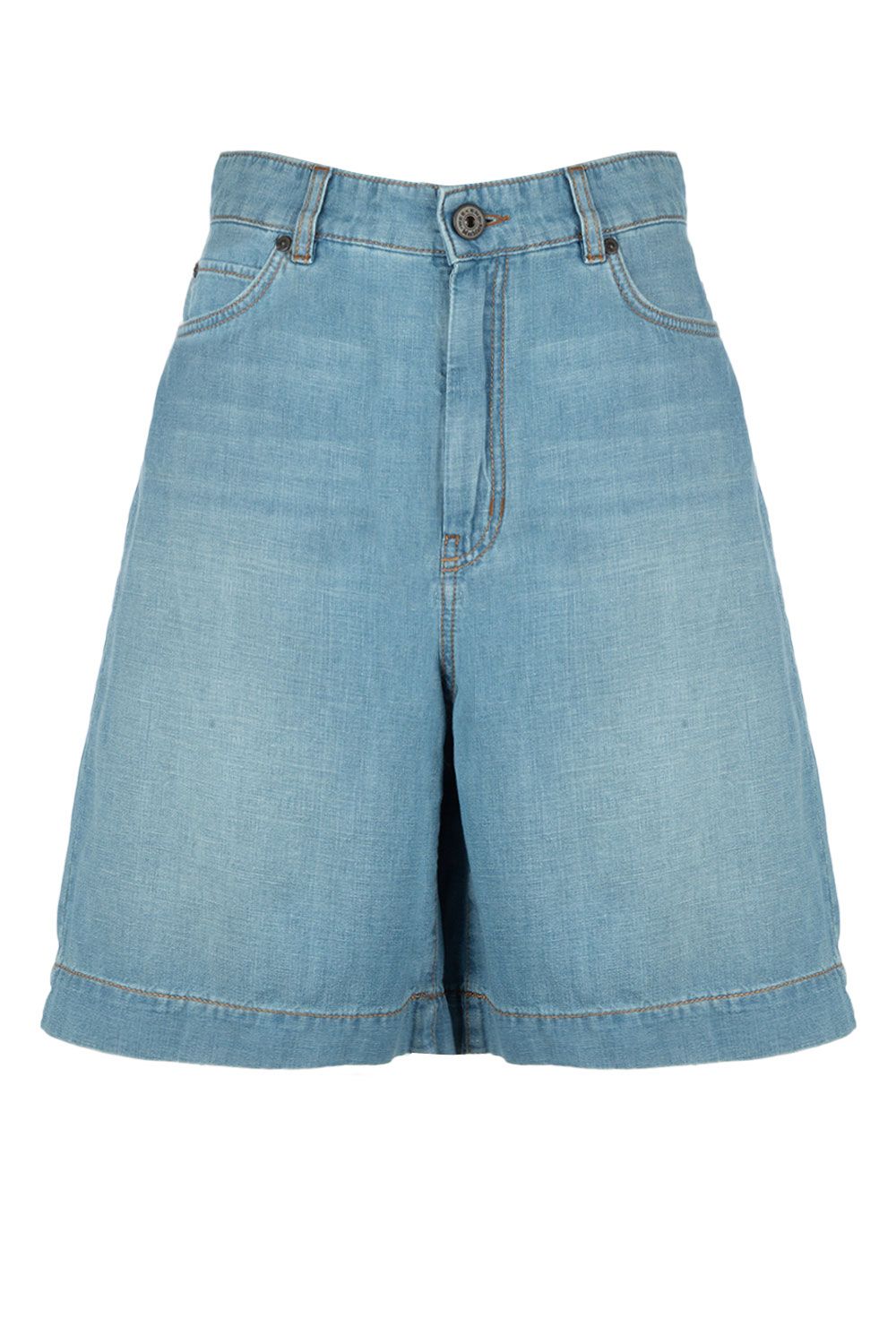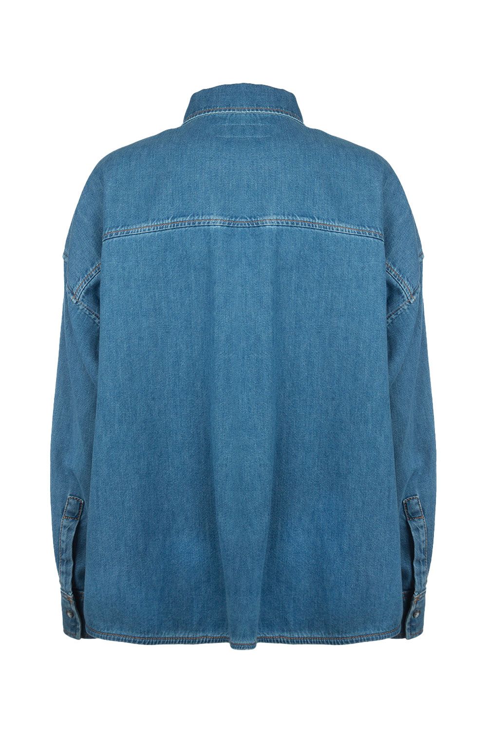 Camicia oversize in denim di cotone azzurro con colletto classico, apertura frontale con bottoni, tasca applicata nella parte frontale e maniche lunghe con polsini