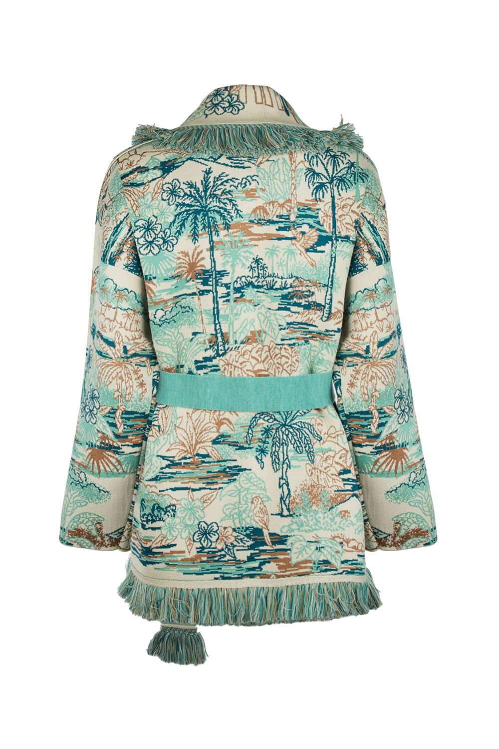 Cardigan in misto lana, cotone e seta panna con motivo jacquard azzurro e cuoio e cintura removibile