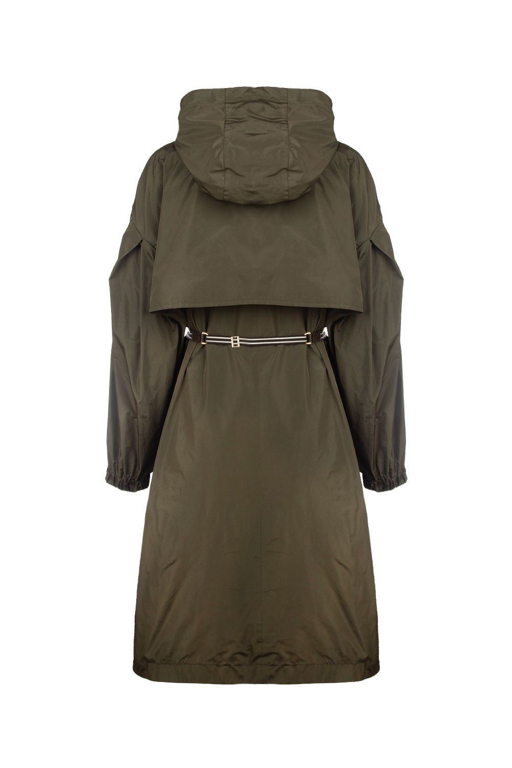 Impermeabile in taffetà verde miliare con apertura frontale con zip e cappuccio. Cintura regolabile e removibile