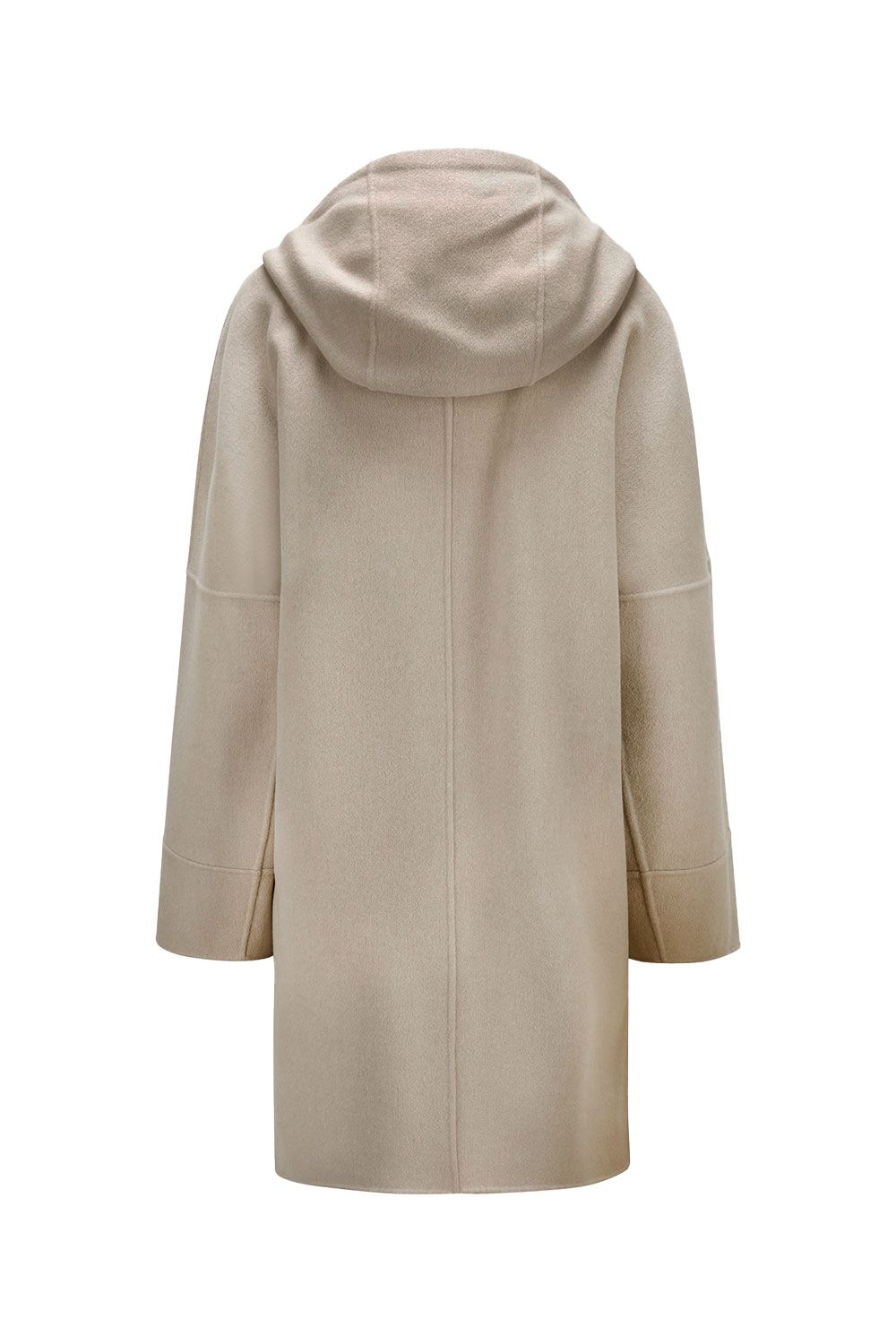 Giaccone oversize in doppio di lana sabbia con apertura frontale con zip, cappuccio, maniche lunghe con bordo alto e tasche applicate nella parte frontale