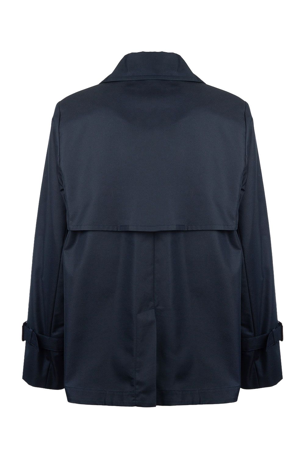 Trench corto in gabardina di cotone antigoccia blu navy con collo con revers corti, apertura frontale con bottoni doppiopetto e maniche lunghe