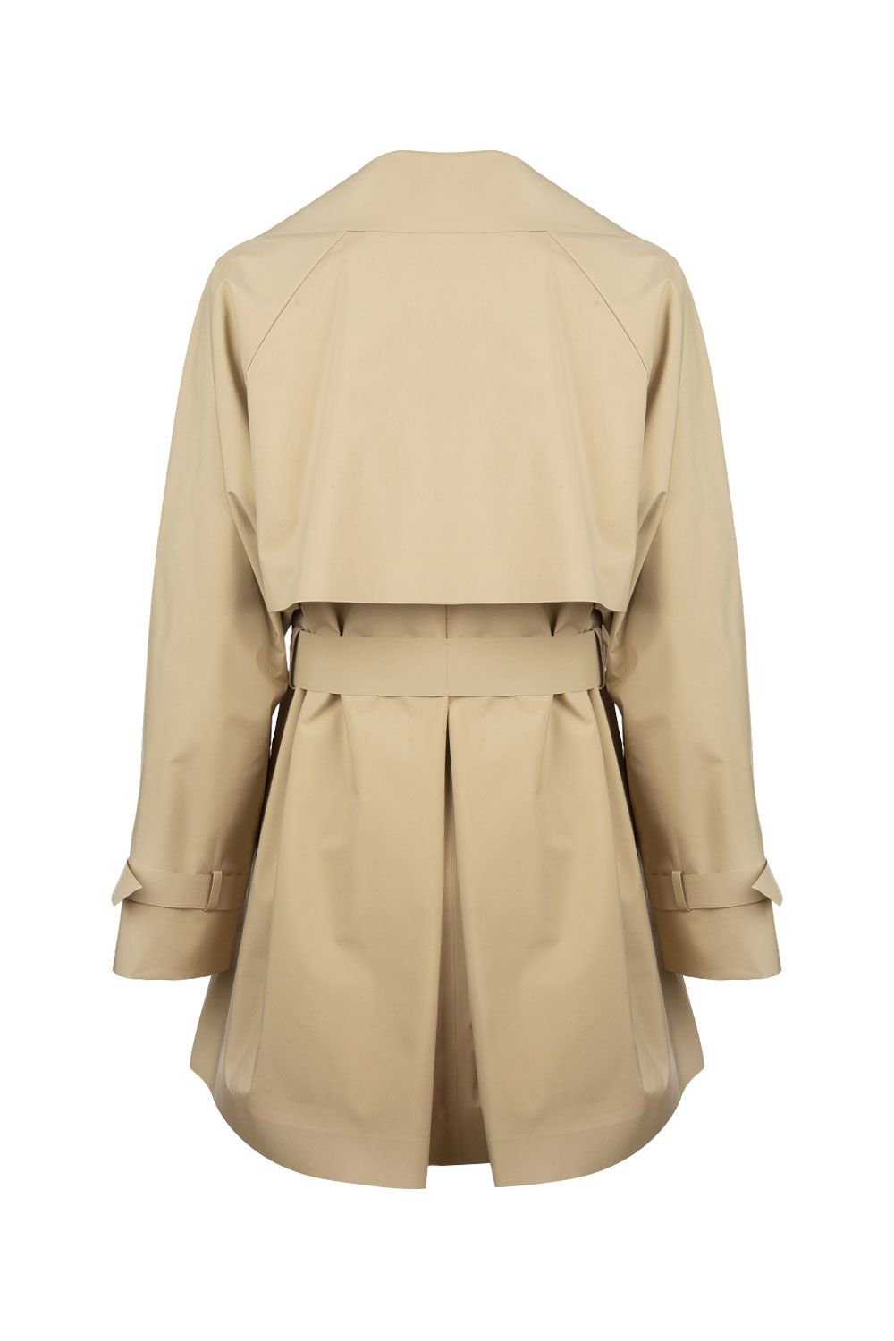 Trench corto in tela tecnica antigoccia beige con collo con revers, apertura frontale con bottoni doppiopetto, maniche lunghe e cintura removibile