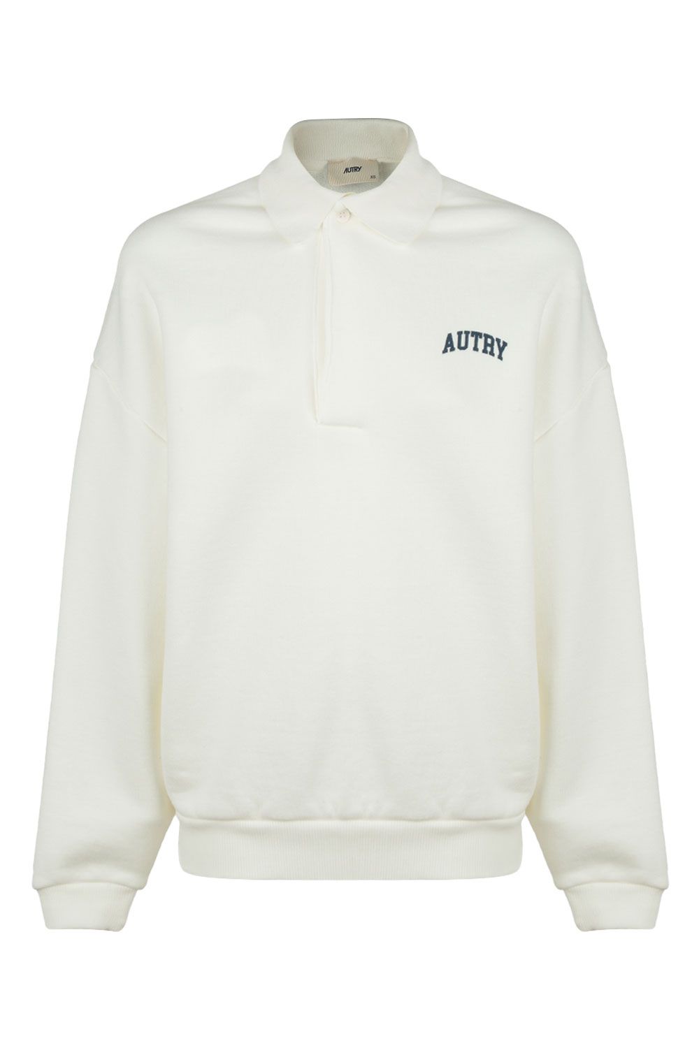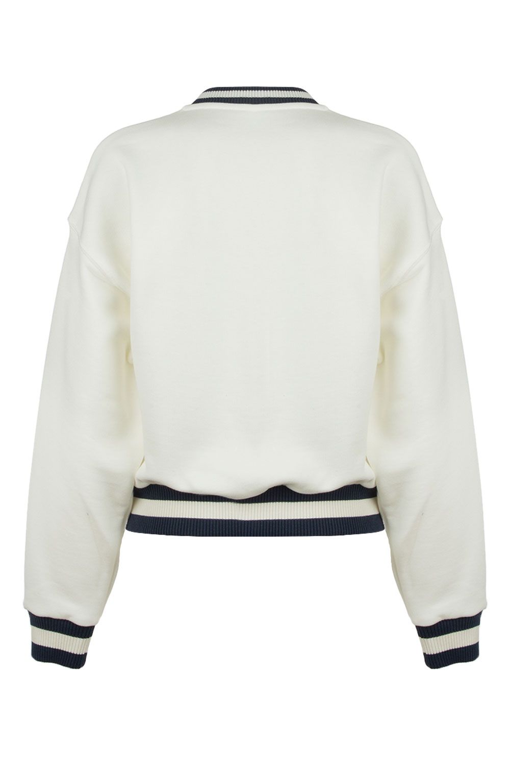 Felpa girocollo in jersey di cotone bianca con logo frontale ricamato con perle e bordi a contrasto