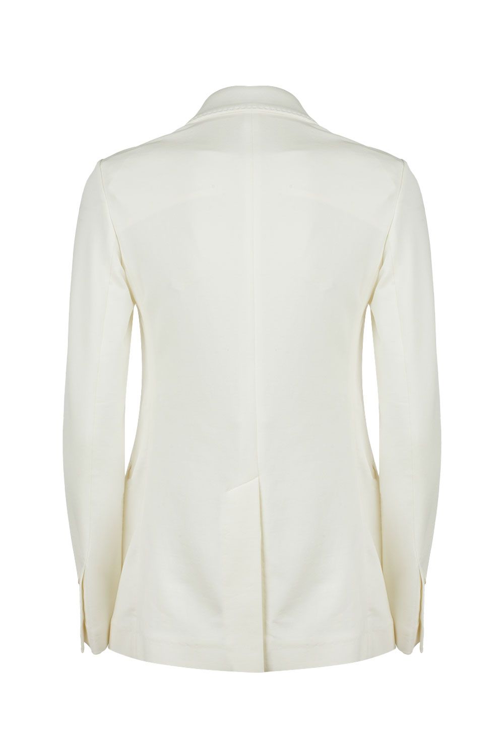 Giacca doppiopetto sfoderata in jersey di cotone stretch bianca con apertura frontale con bottoni, revers a lancia con impuntura sartoriale e maniche lunghe