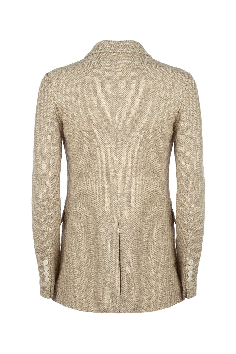 Giacca doppiopetto sfoderata in maglia di cotone e lino stretch mélange sabbia con apertura frontale bottoni, revers classici e maniche lunghe