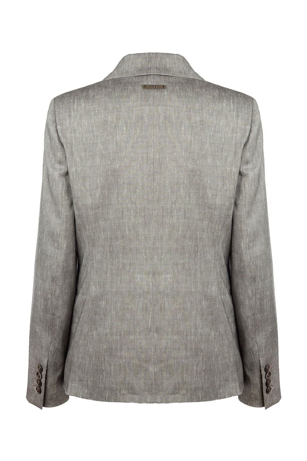 Giacca doppiopetto in tela di misto lino tortora con revers a lancia, apertura frontale con bottoni e maniche lunghe