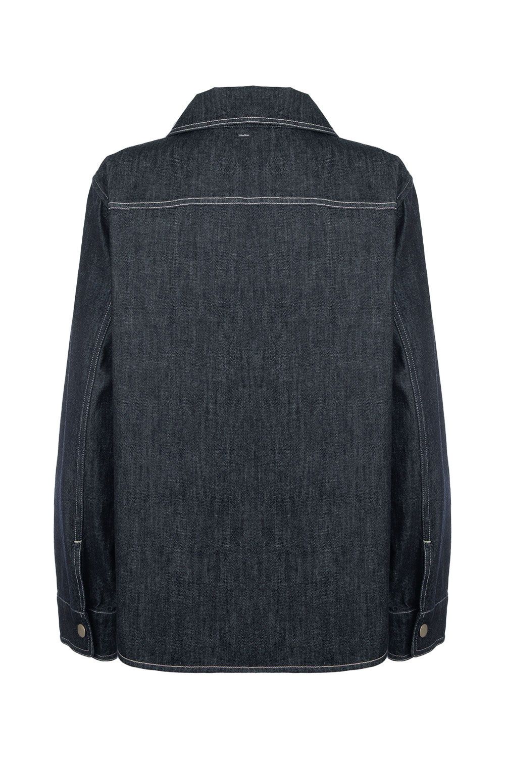Giacca in denim di cotone blu con colletto classico, apertura frontale con bottoni e maniche lunghe con polsini