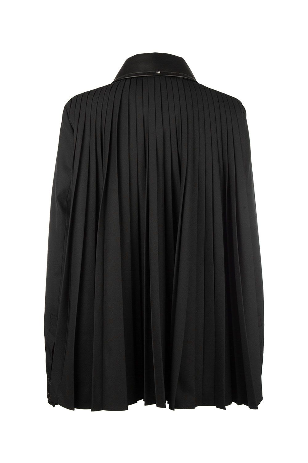 Giacca in gabardina di cotone antigoccia nera con apertura frontale con bottoni, colletto classico in pelle nera, tasche frontali applicate, maniche lunghe con bordo alto e parte posteriore plissettata