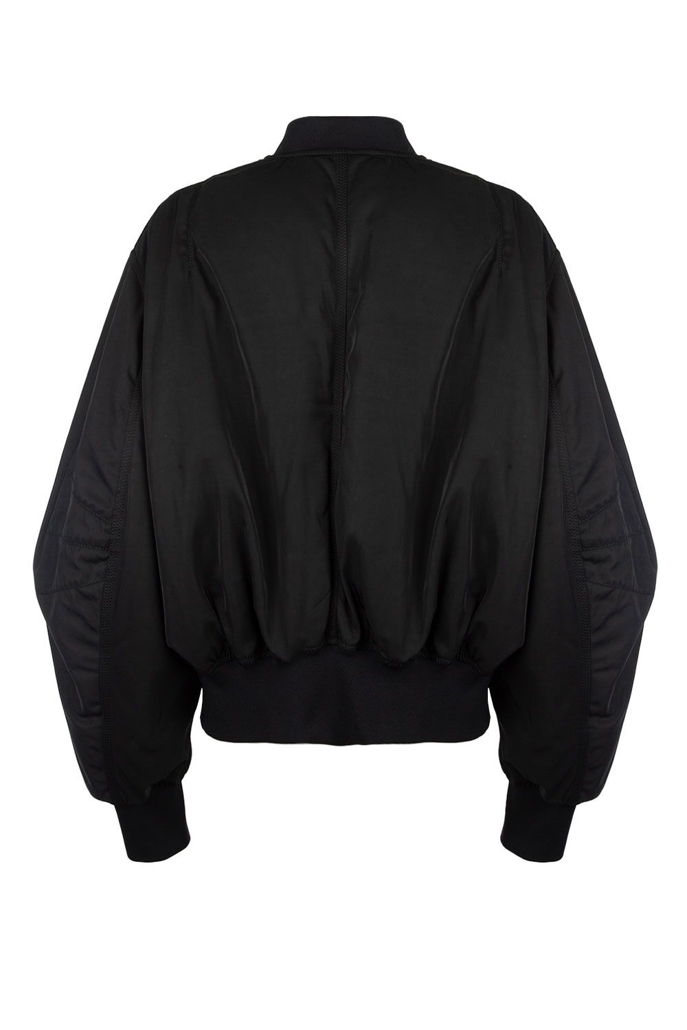 Bomber oversize in nylon nero con bordi in maglia tono su tono, apertura frontale con zip e maniche lunghe ampie