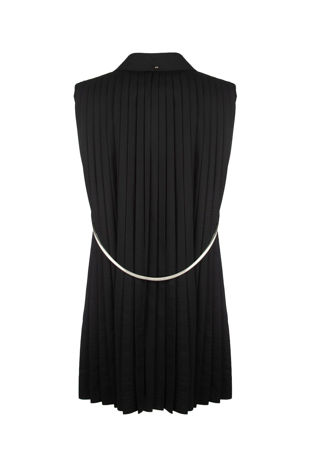 Gilet in gabardina di lana nera con colletto con revers corti, apertura frontale con bottoni doppiopetto automatici nascosti, tasche con patta applicate nella parte frontale e parte posteriore plissettata con cintura in metallo argento removibile applicata