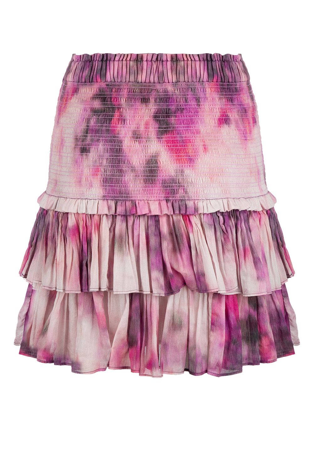 Mini gonna in mussola di cotone stampa tie dye rosa con punto smock in vita e balze sul fondo