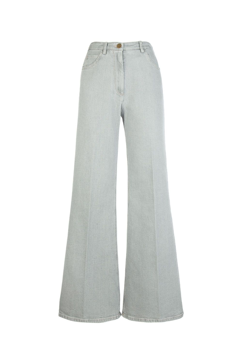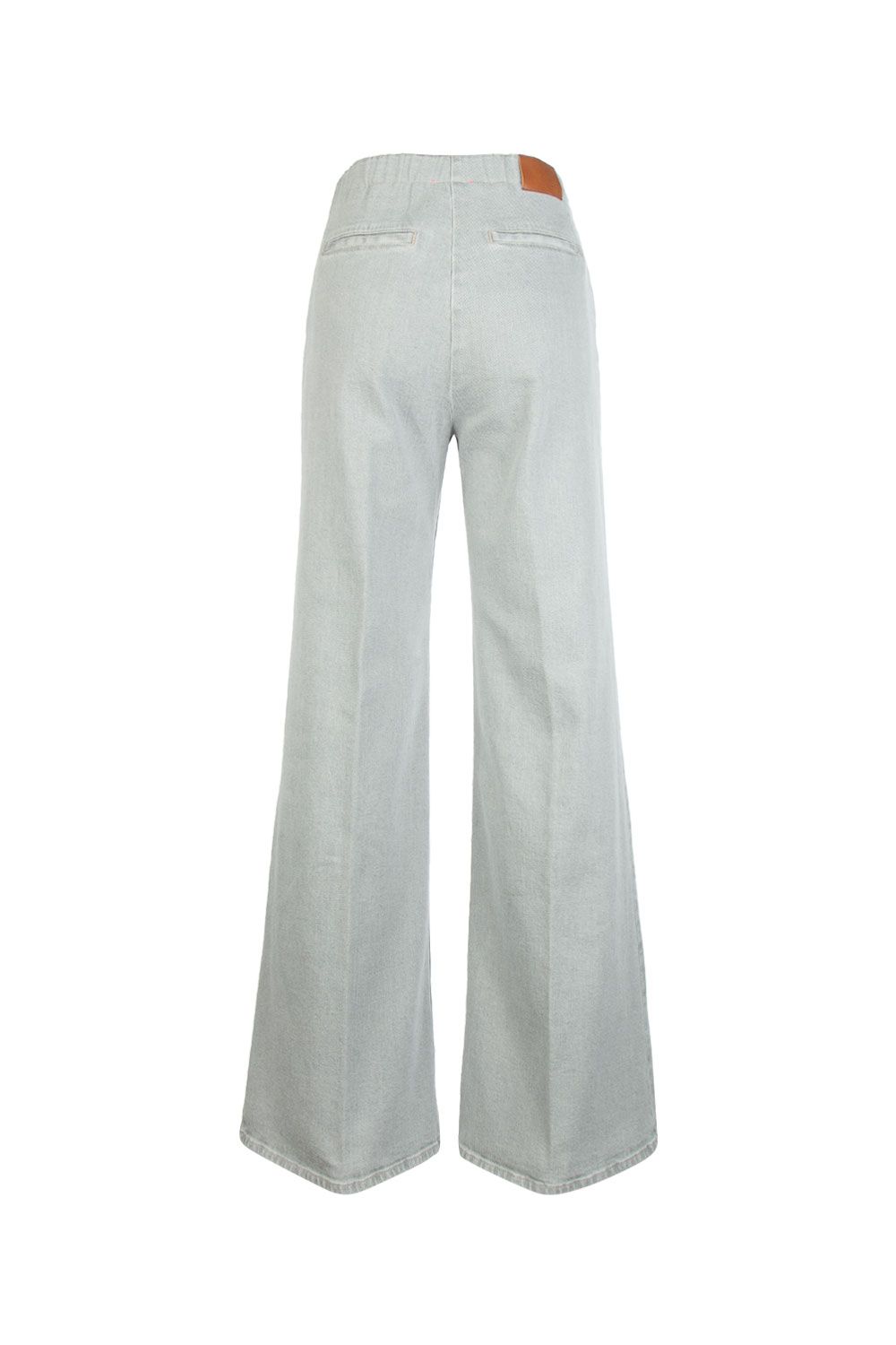 Jeans gamba lunga e ampia in cotone grigio chiaro a tela morbida, elastico sul retro e chiusura con bottone e zip frontale, due tasche a filetto sul retro