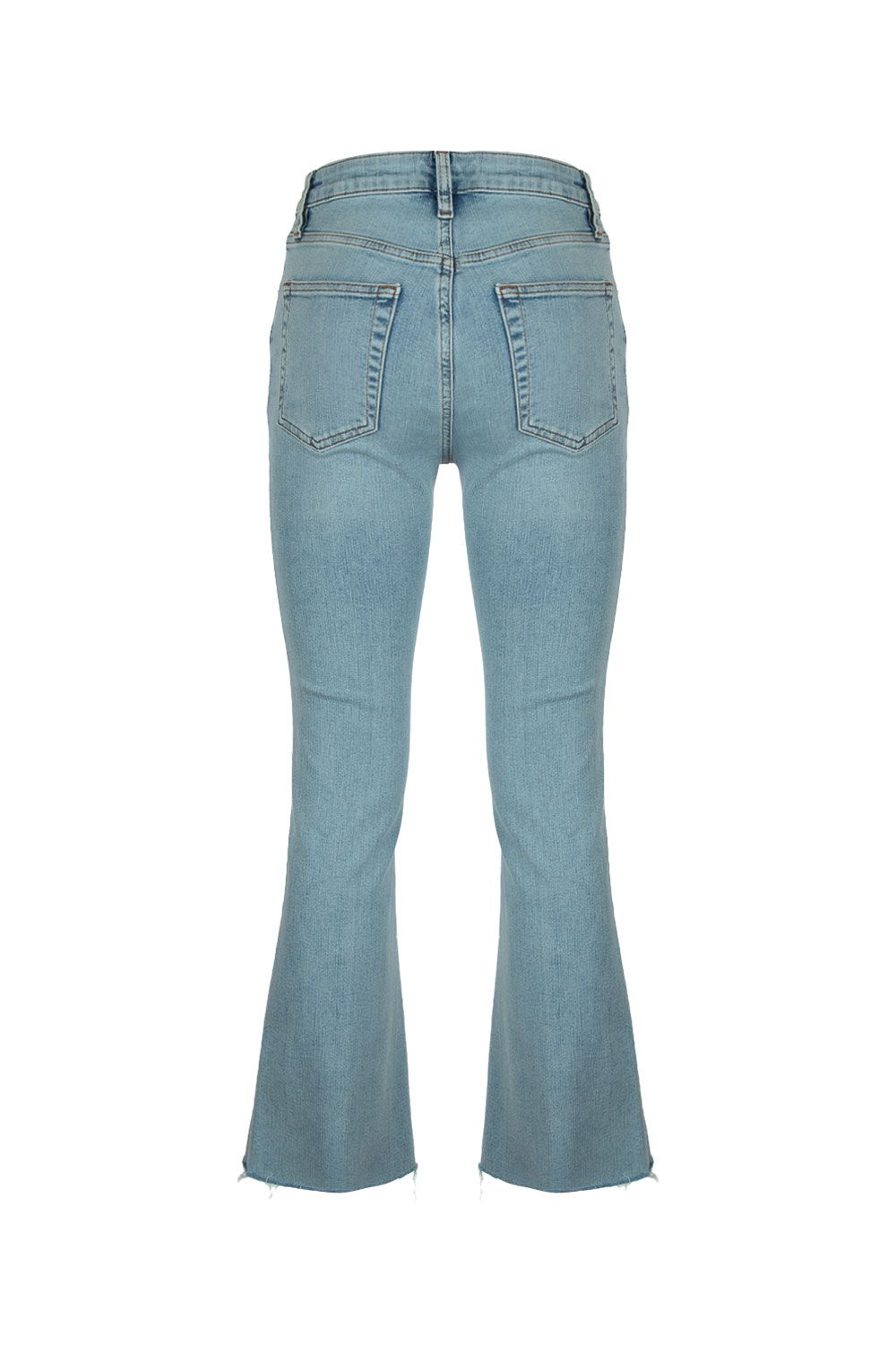 Jeans in denim di cotone stretch azzurro chiaro a gamba slim flare con orlo sfrangiato