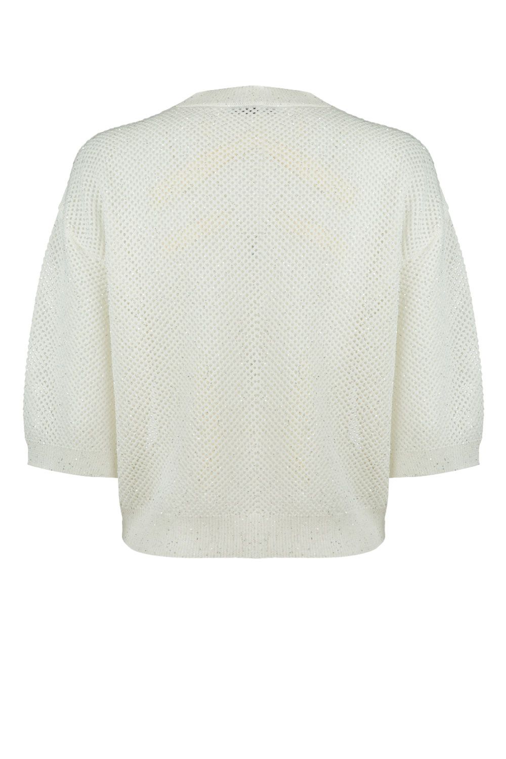 Maglia girocollo a rete di cotone bianca e paillettes argento a maniche corte