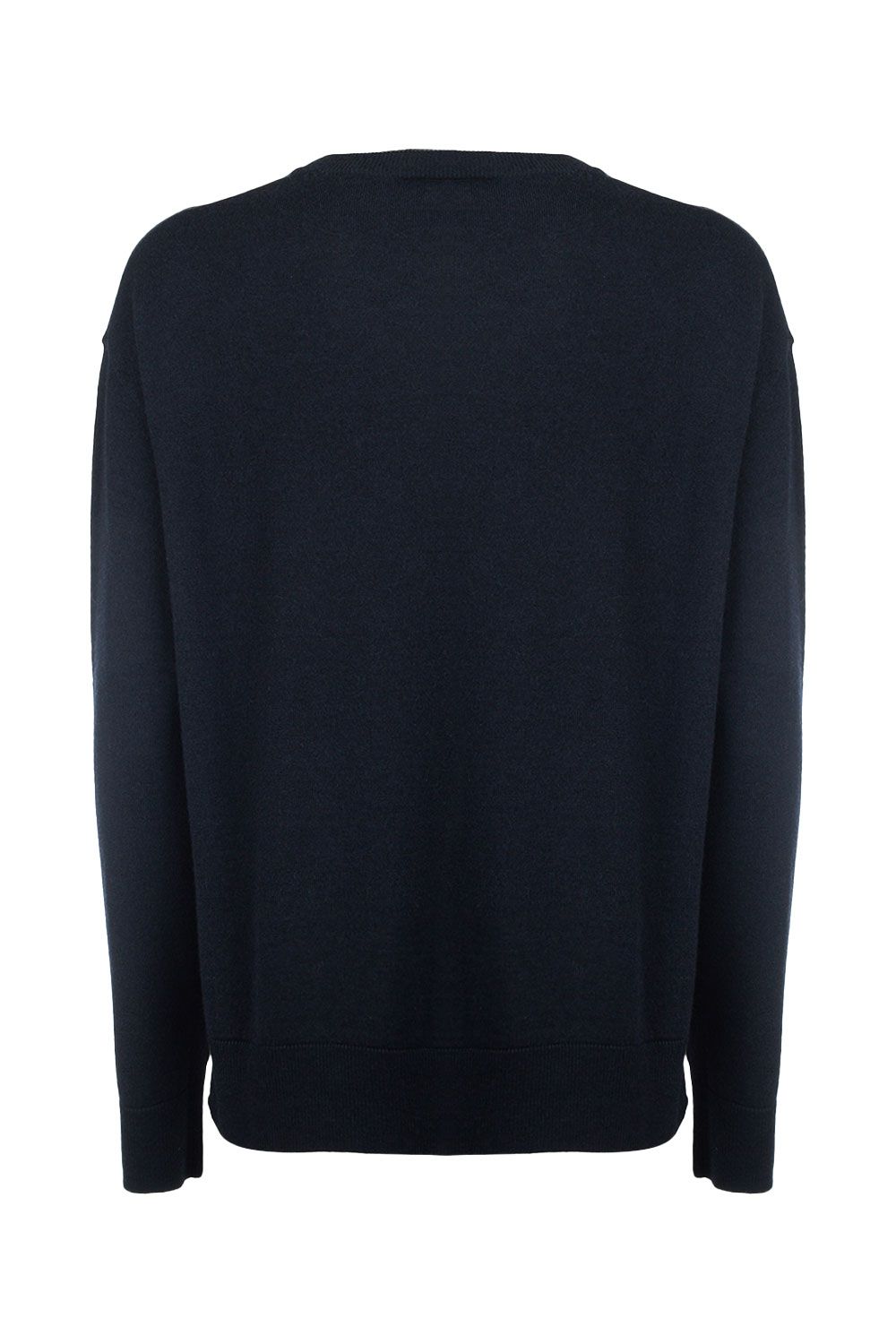 Maglia girocollo in lana leggera blu navy con spacchi laterali e fondo asimmetrico