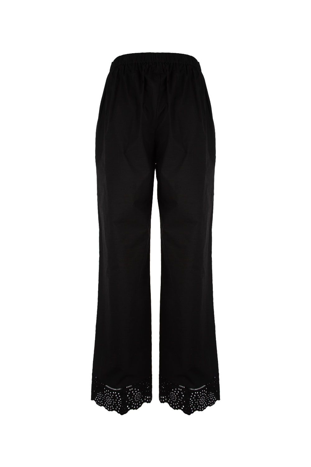 Pantaloni in popeline di cotone nero a gamba ampia con inserto in sangallo tono su tono, vita elasticata nella parte posteriore e tasche laterali