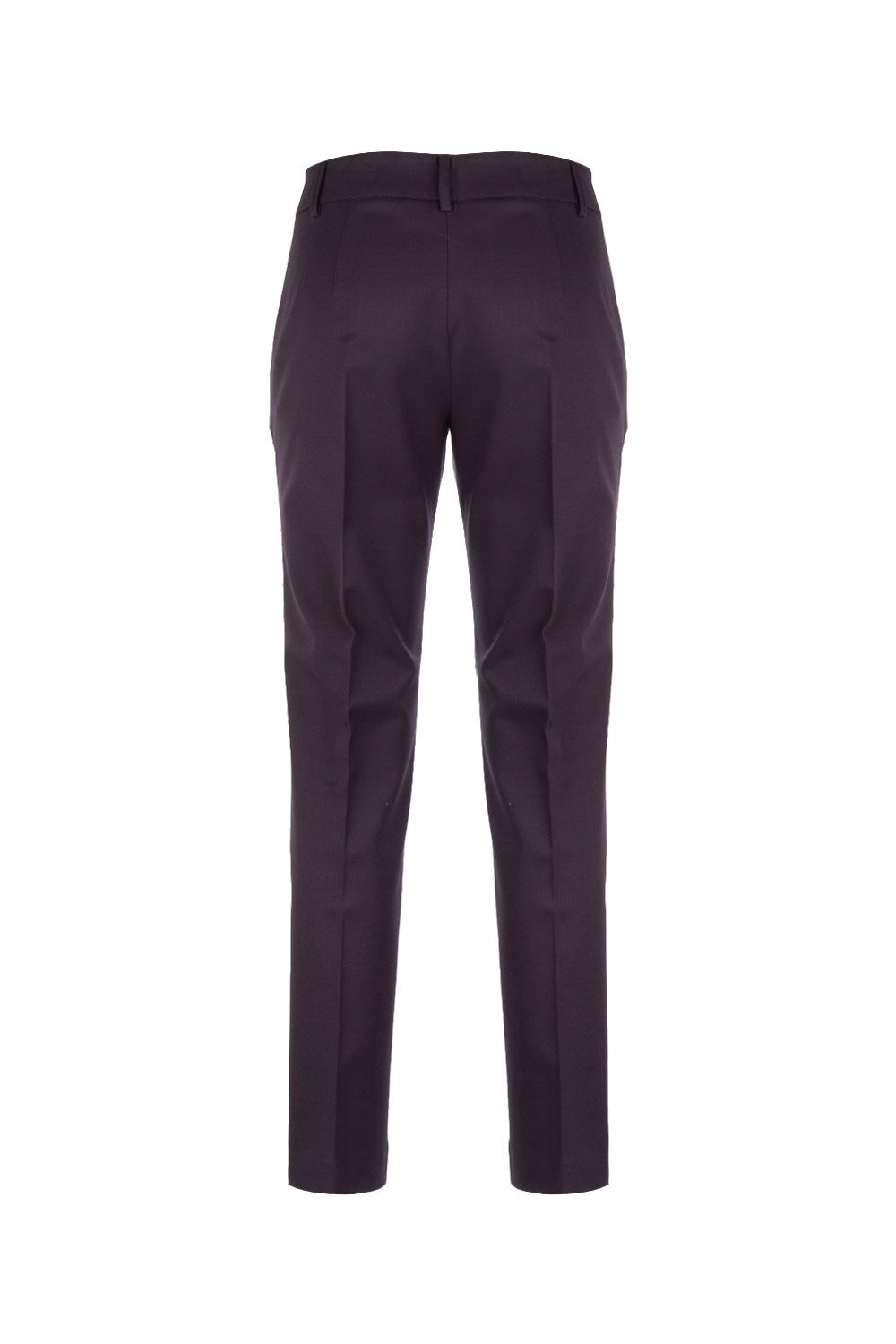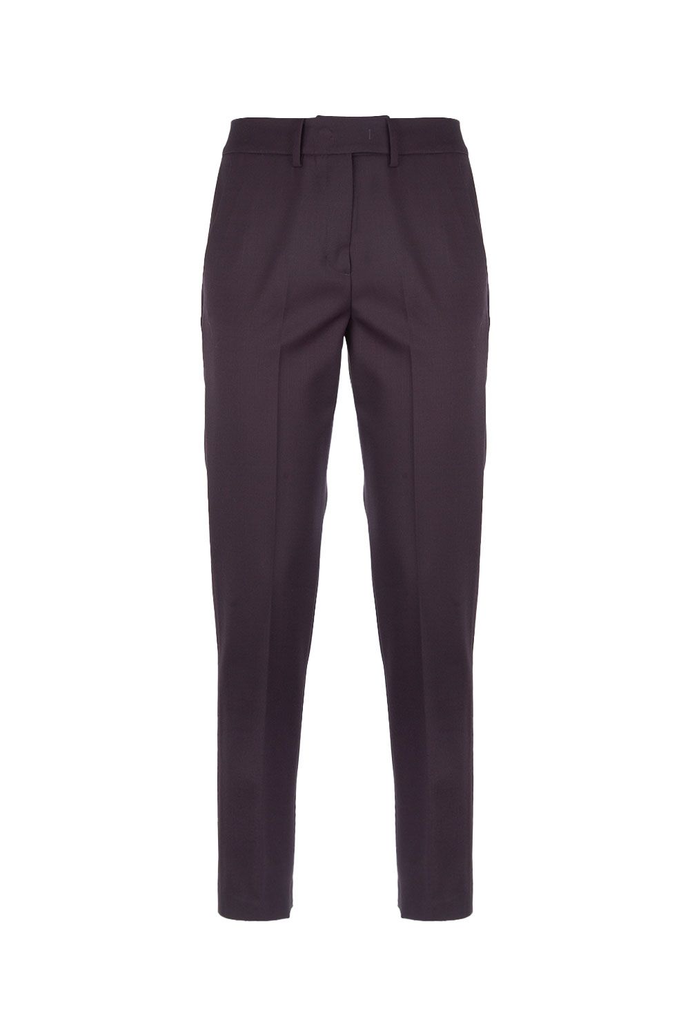 Pantaloni gamba dritta leggermente svasata sul fondo in misto lana melanzana, due tasche a filetto laterali e sul retro, chiusura con bottone gancio e zip