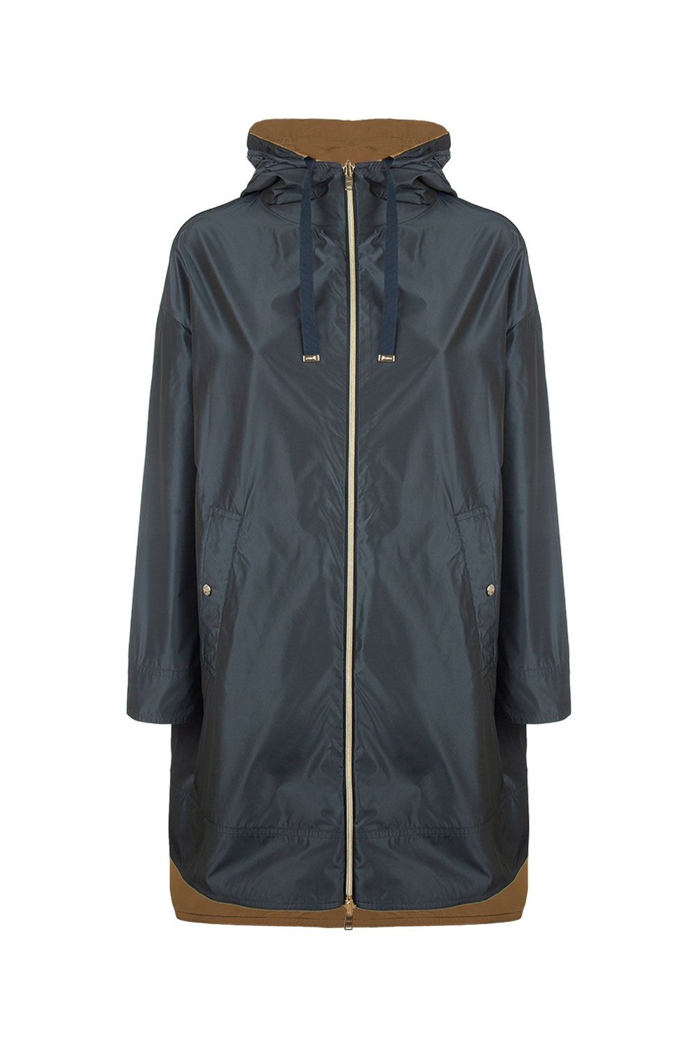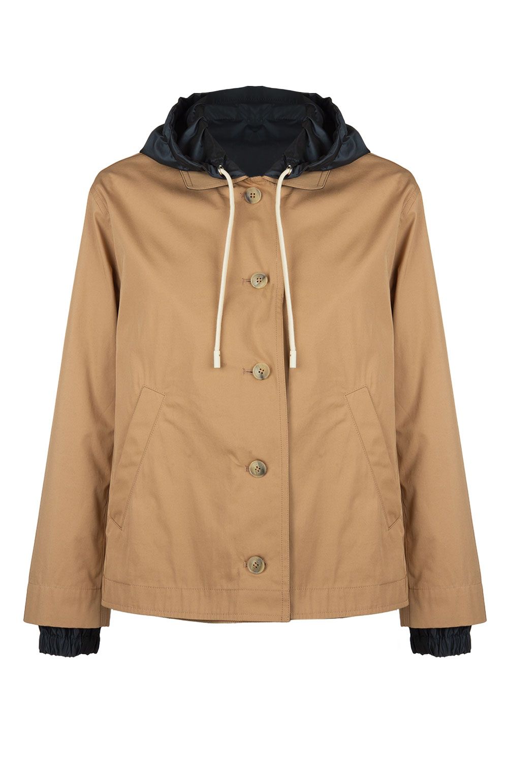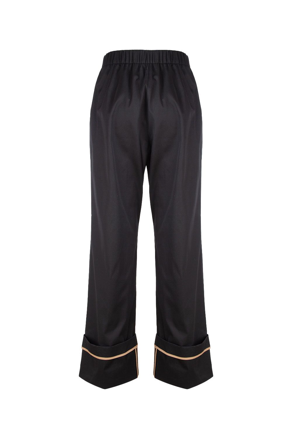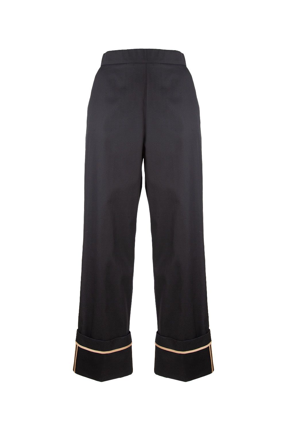 Pantaloni in gabardina di cotone blu navy a gamba slim crop con risvolto alto con cuciture cammello a contrasto, vita elasticata nella parte posteriore e tasche laterali