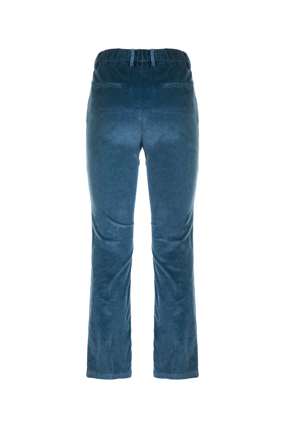 Pantaloni in velluto a coste blu , gamba slim leggermente svasata sul fondo, elastico sul retro, chiusura con bottone e zip, passanti, due tasche a filetto laterali e sul retro