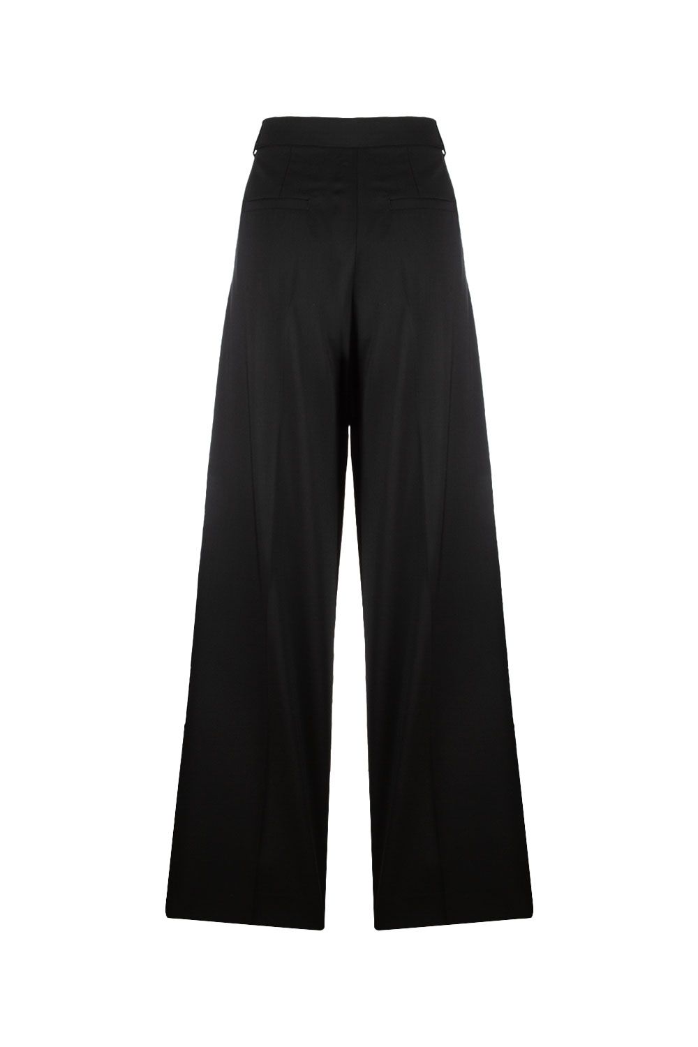 Pantaloni in gabardina di lana neri a gamba ampia con tasche laterali a filetto e cintura in vita con fibbia argento