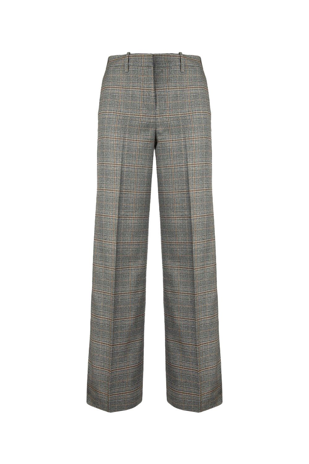 Pantaloni gamba lunga ampia in misto viscosa pied de poule sui toni del girgio, nero e marrone, chiusura con gancio bottone e zip, passanti, due tasche laterali e sul retro con bottone a filetto